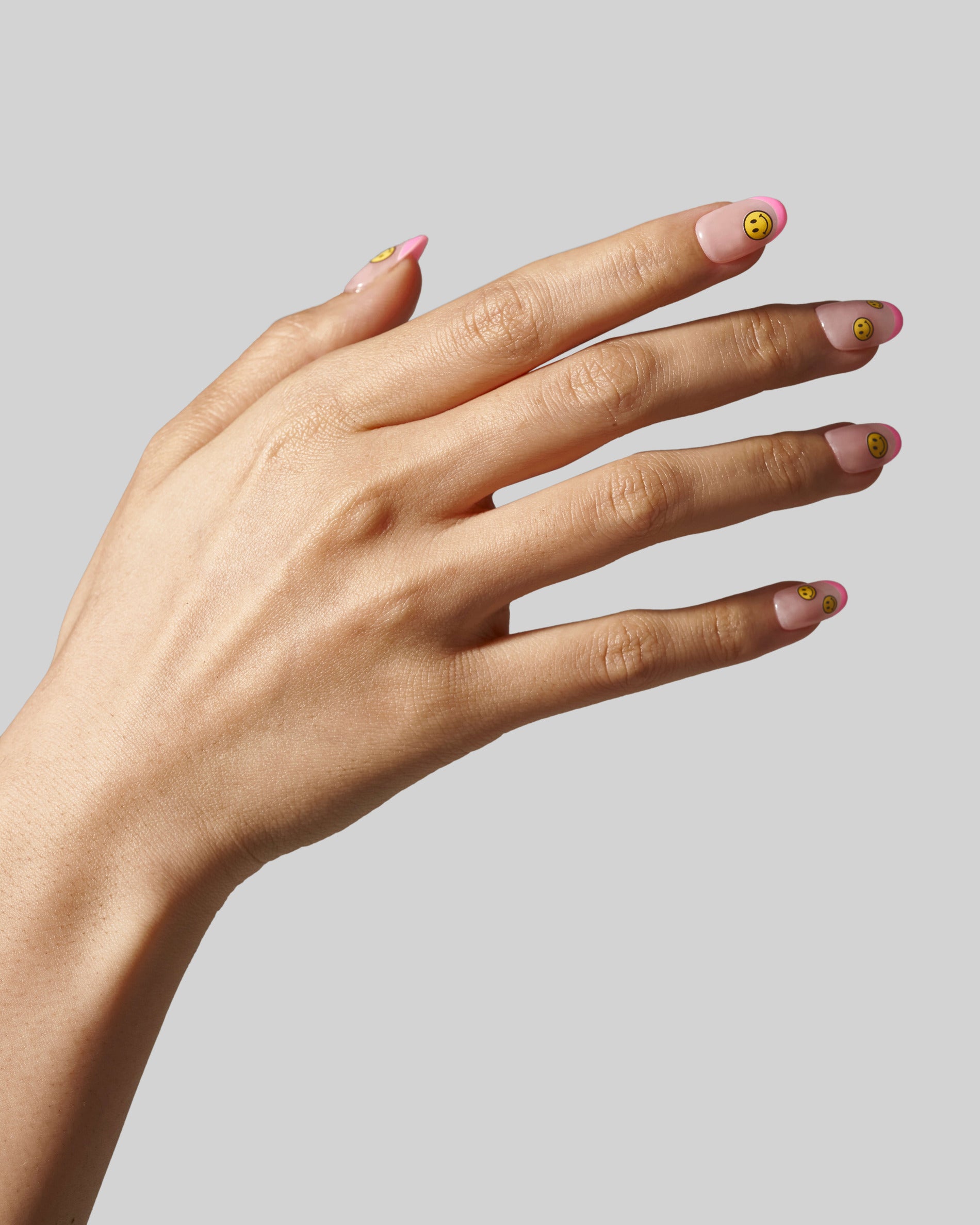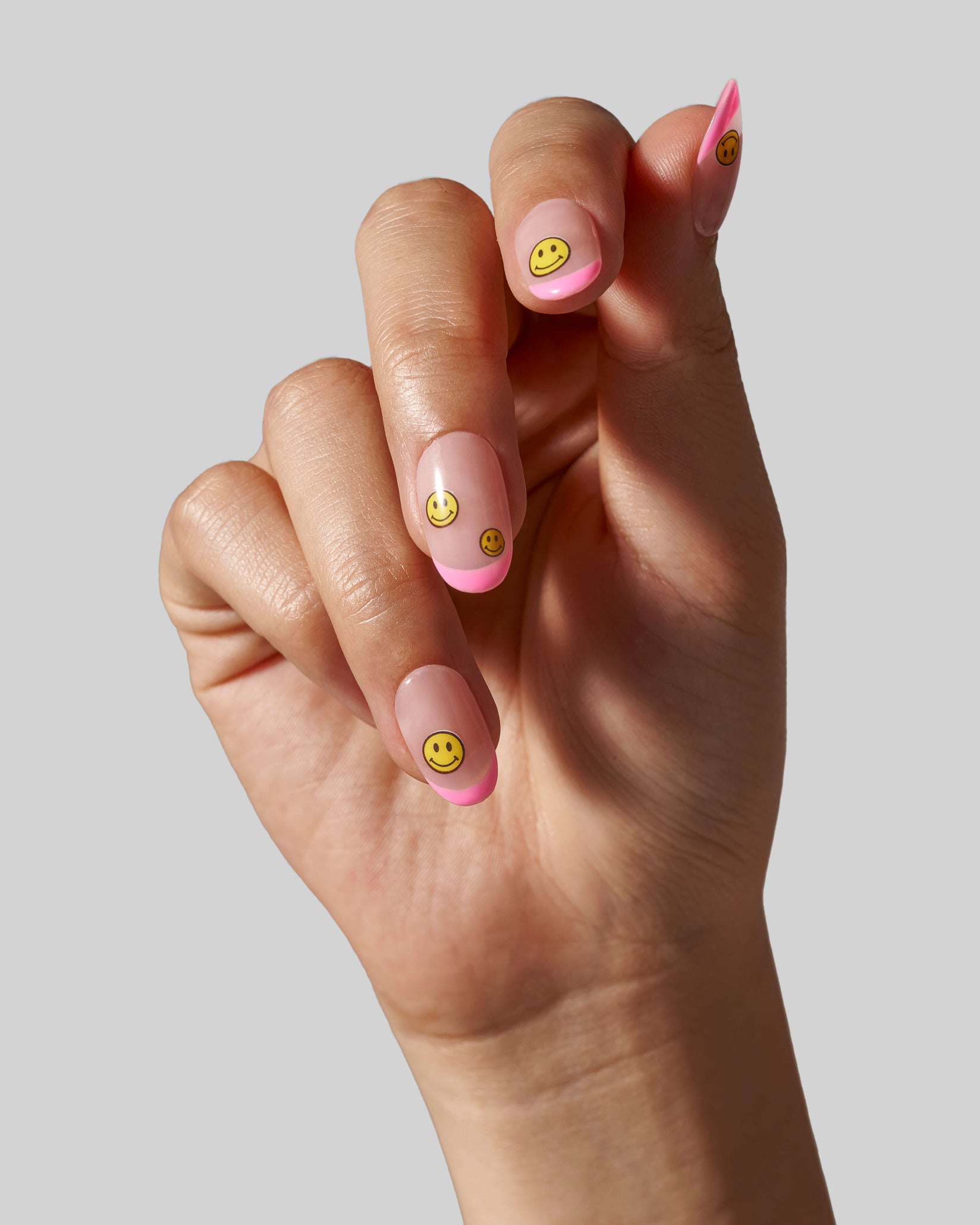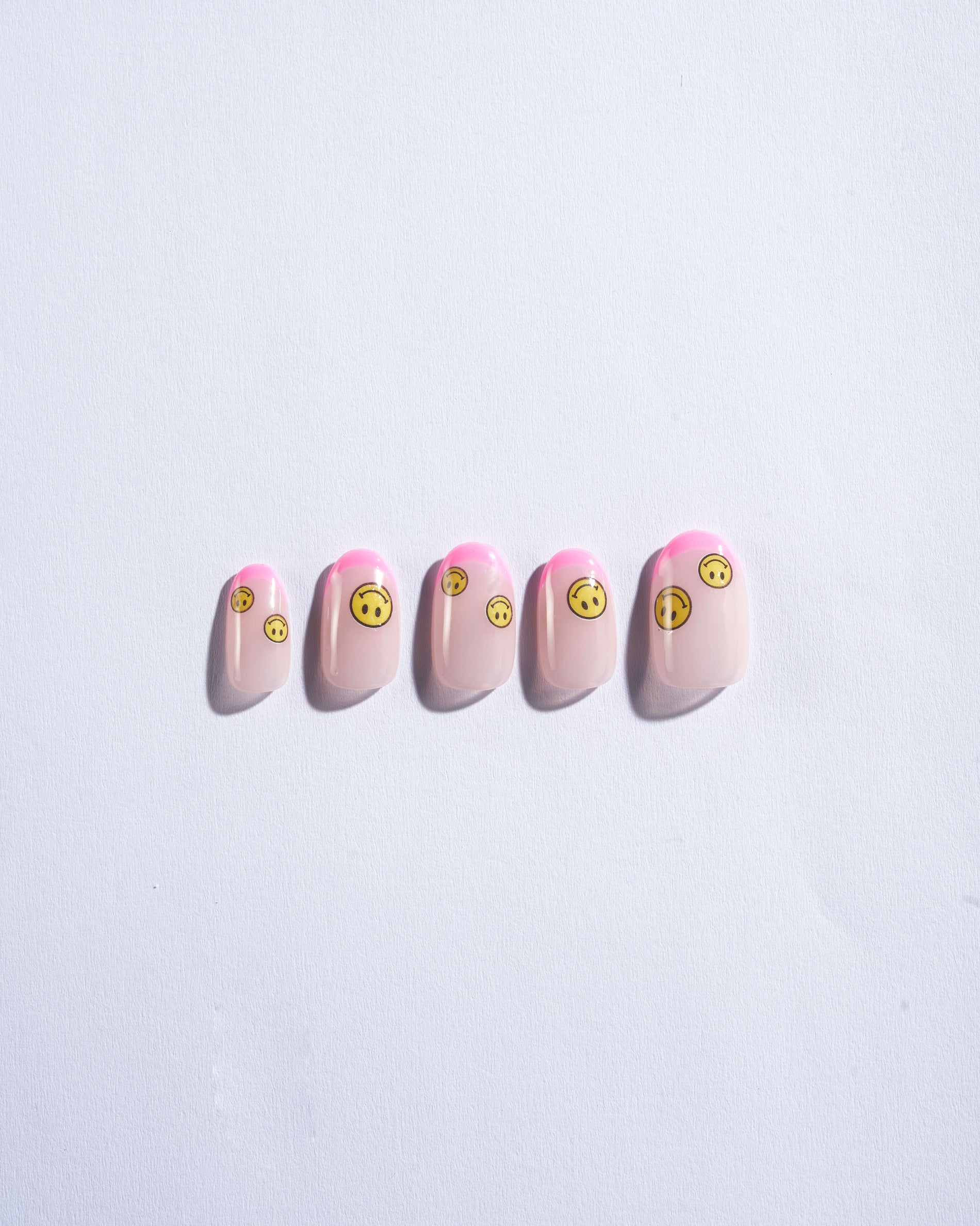 Whimsy, playful, and cutesy. A Perfect Day is a short-length creamy nude nail, a Barbie pink French tip, and cute yellow smiley face designs. A Perfect Day is all in the name - ideal for a whimsy Saturday, a brunch or a picnic perhaps?
