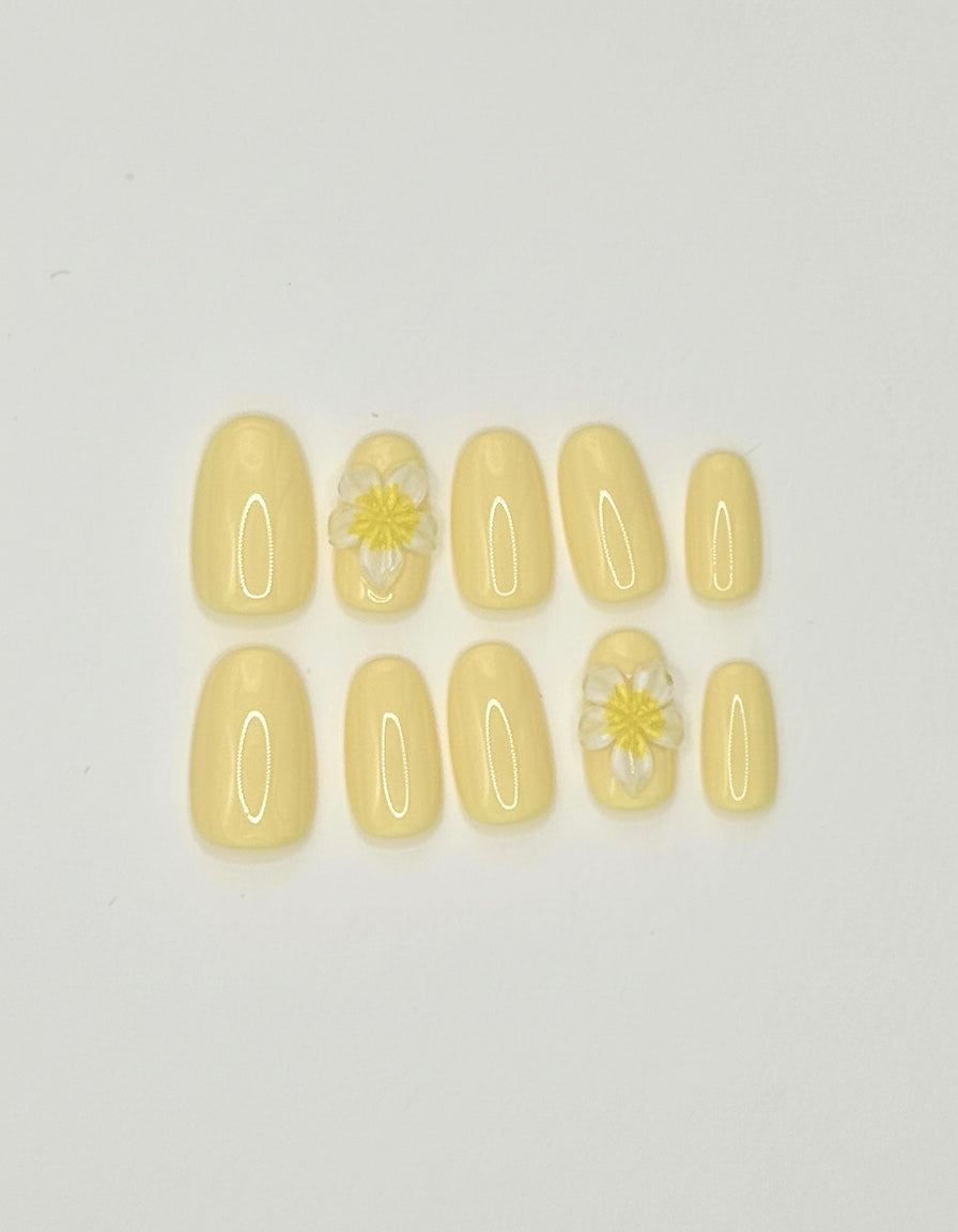 Butter yellow with handcrafted 3D daisies. Main character energy in nail form.