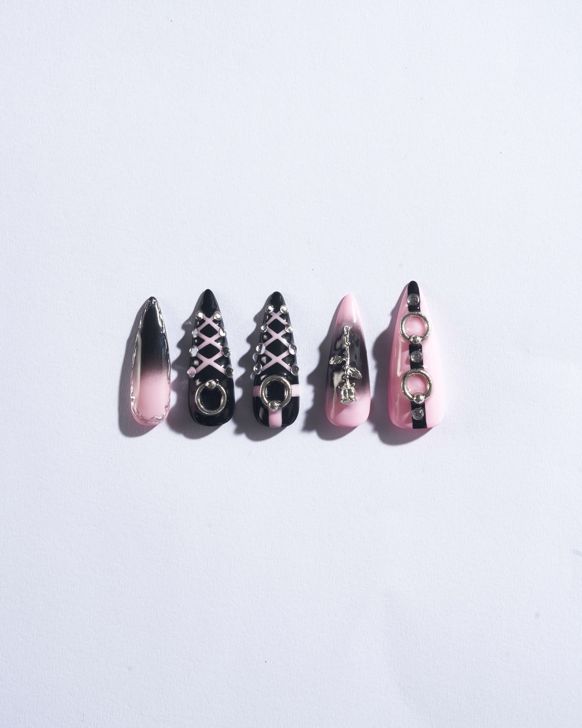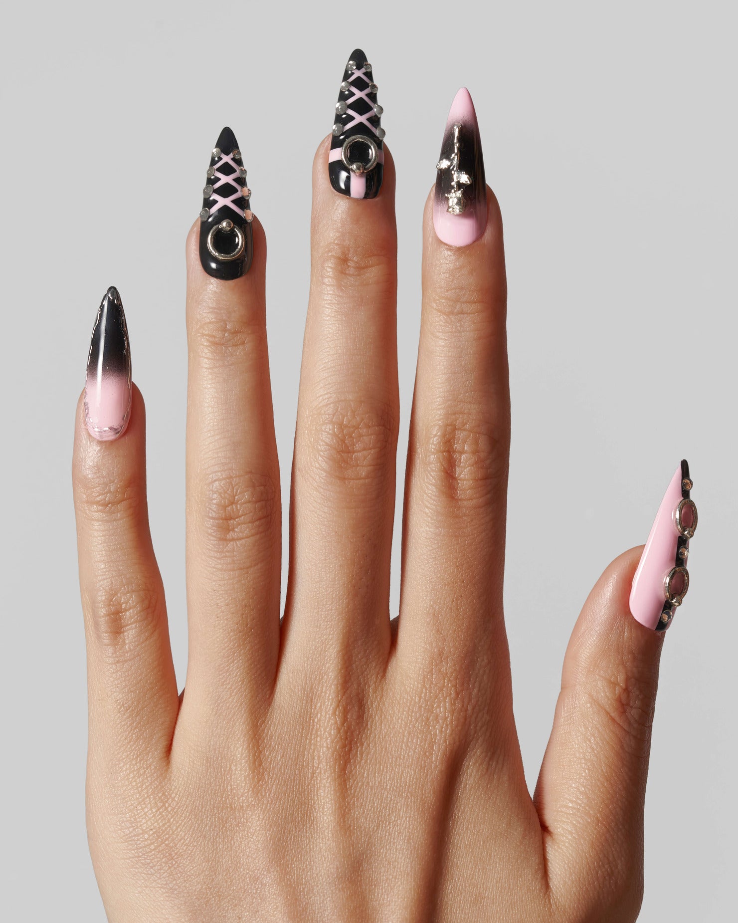 The perfect blend of sexy and girlie, these long, stiletto-shaped press-on nails in pastel pink and sultry black ombre are adorned with 3D silver embellishments and laced-up details. Perfect for a night out with friends, Black Pink will elevate your look and make every moment feel special.