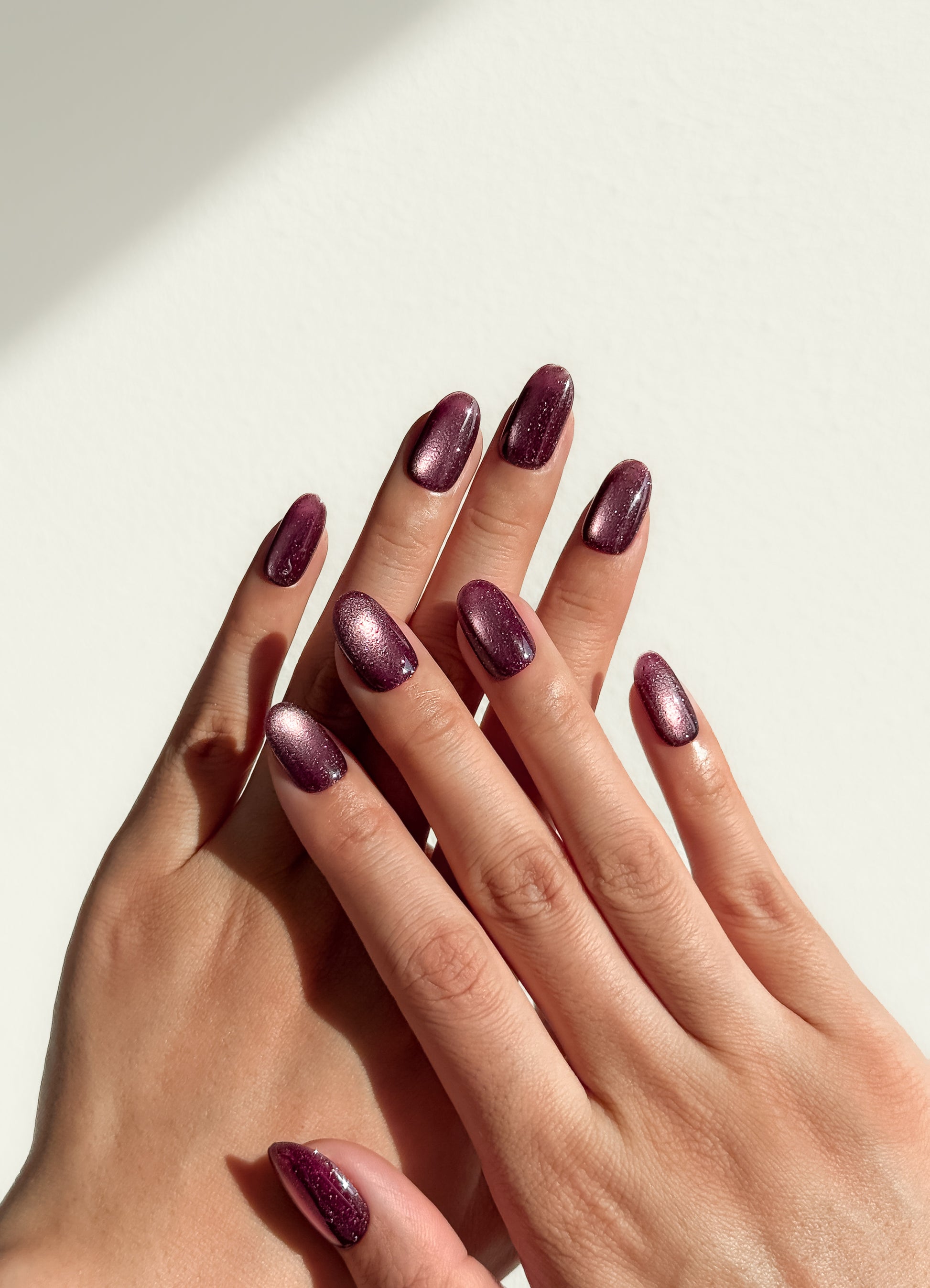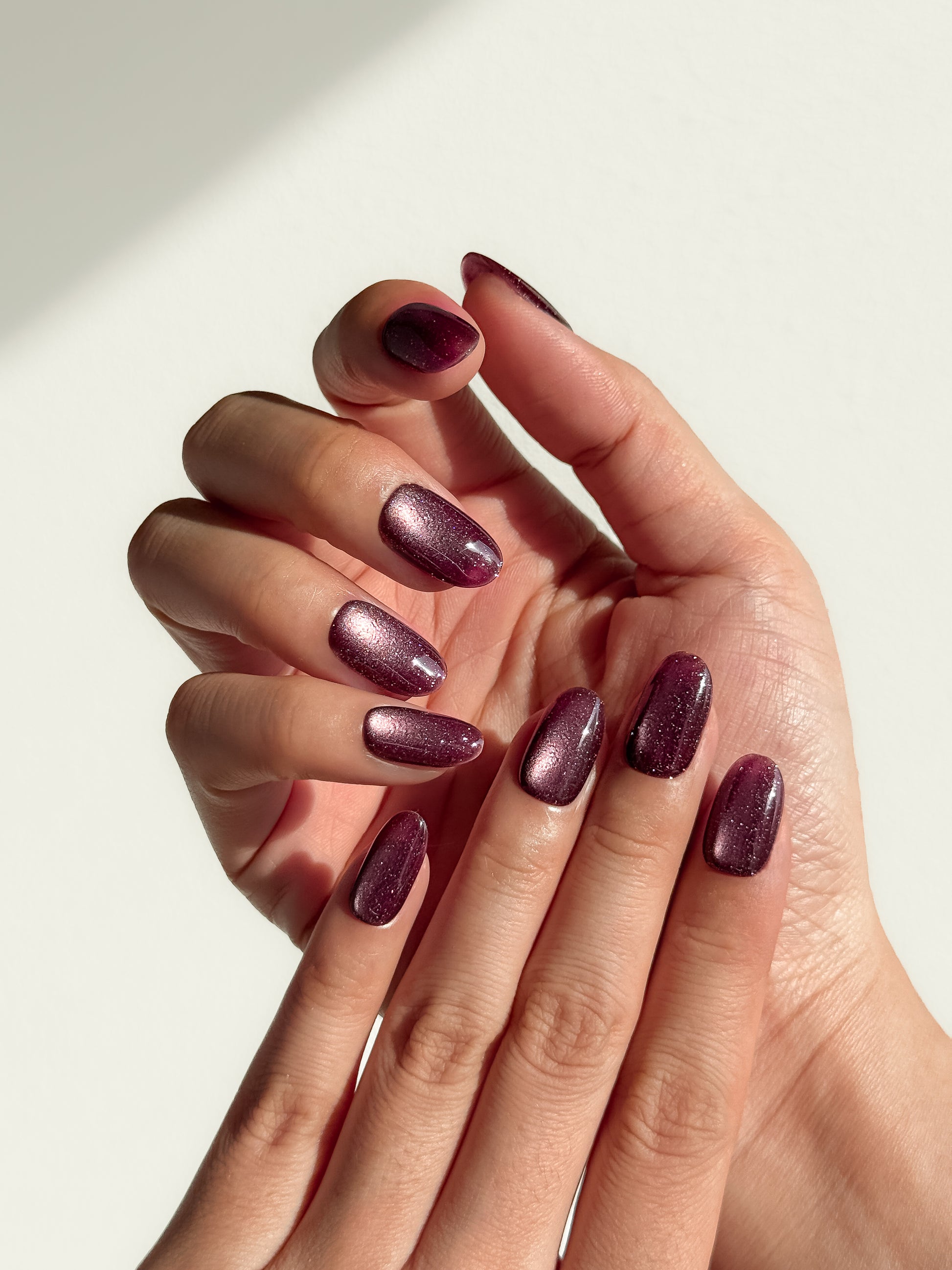 Deep burgundy with a magnetic cat-eye shimmer and subtle sparkle - like fine wine catching candlelight. The perfect burgundy that makes every moment feel expensive.
