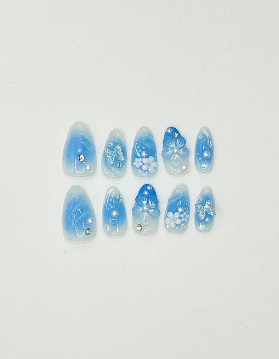 Blue gradient with handcrafted 3D butterflies, florals, pearls, and crystal accents in short almond. Reusable ethereal luxury.