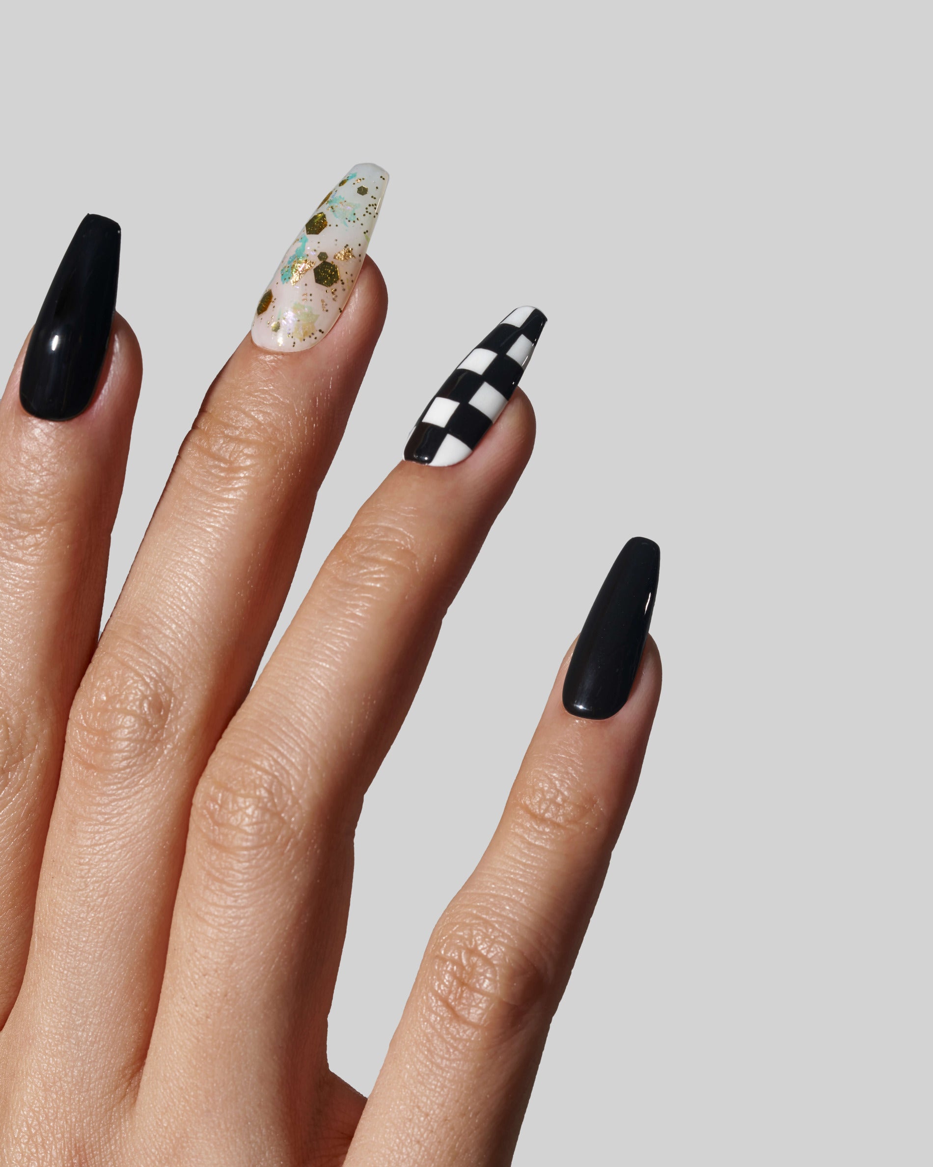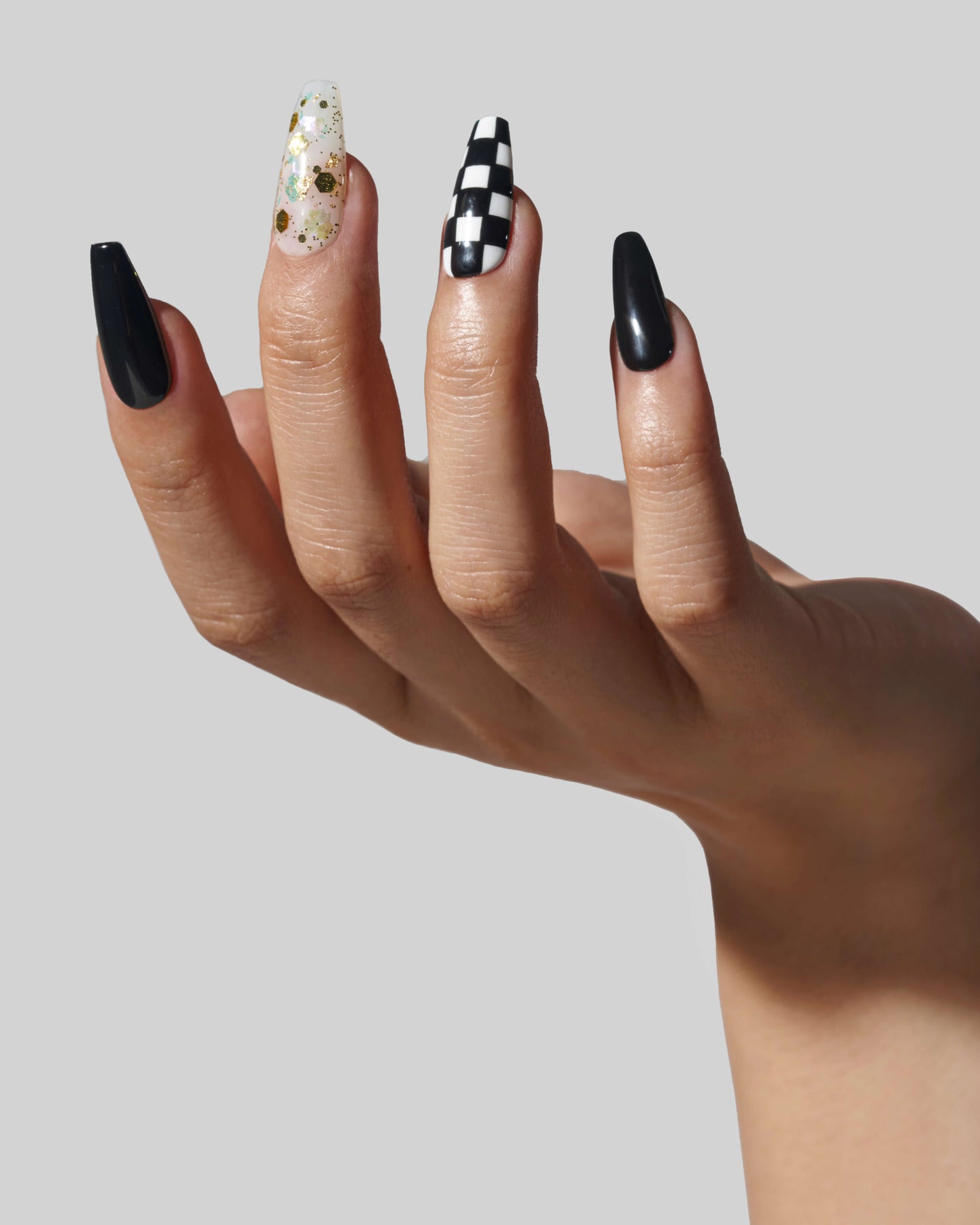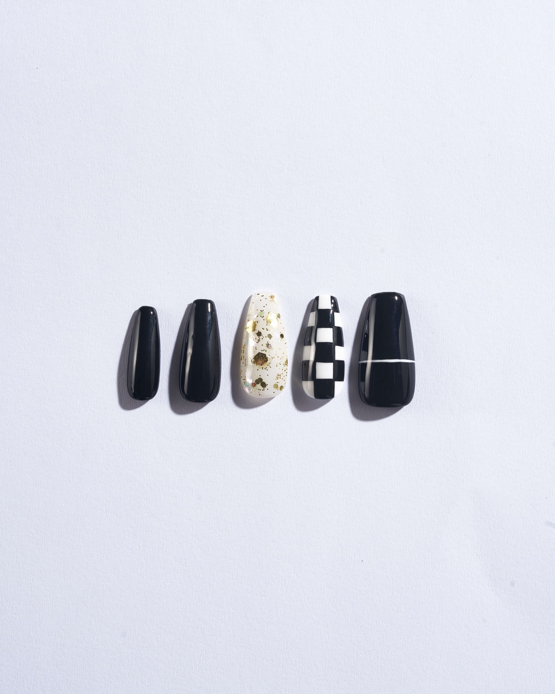 Make your next move a stylish one with this bold, chess-inspired design. A sleek black base polish sets the stage for a striking checkered pattern, accented with luxurious gold confetti-style glitters over a creamy white backdrop. In a medium coffin shape, these nails ensure you’ll always be steps ahead in the style game.