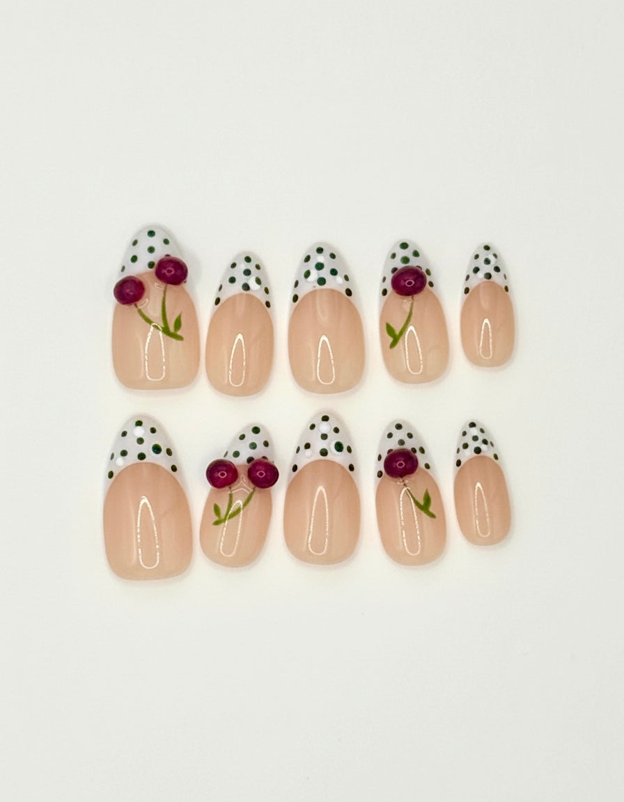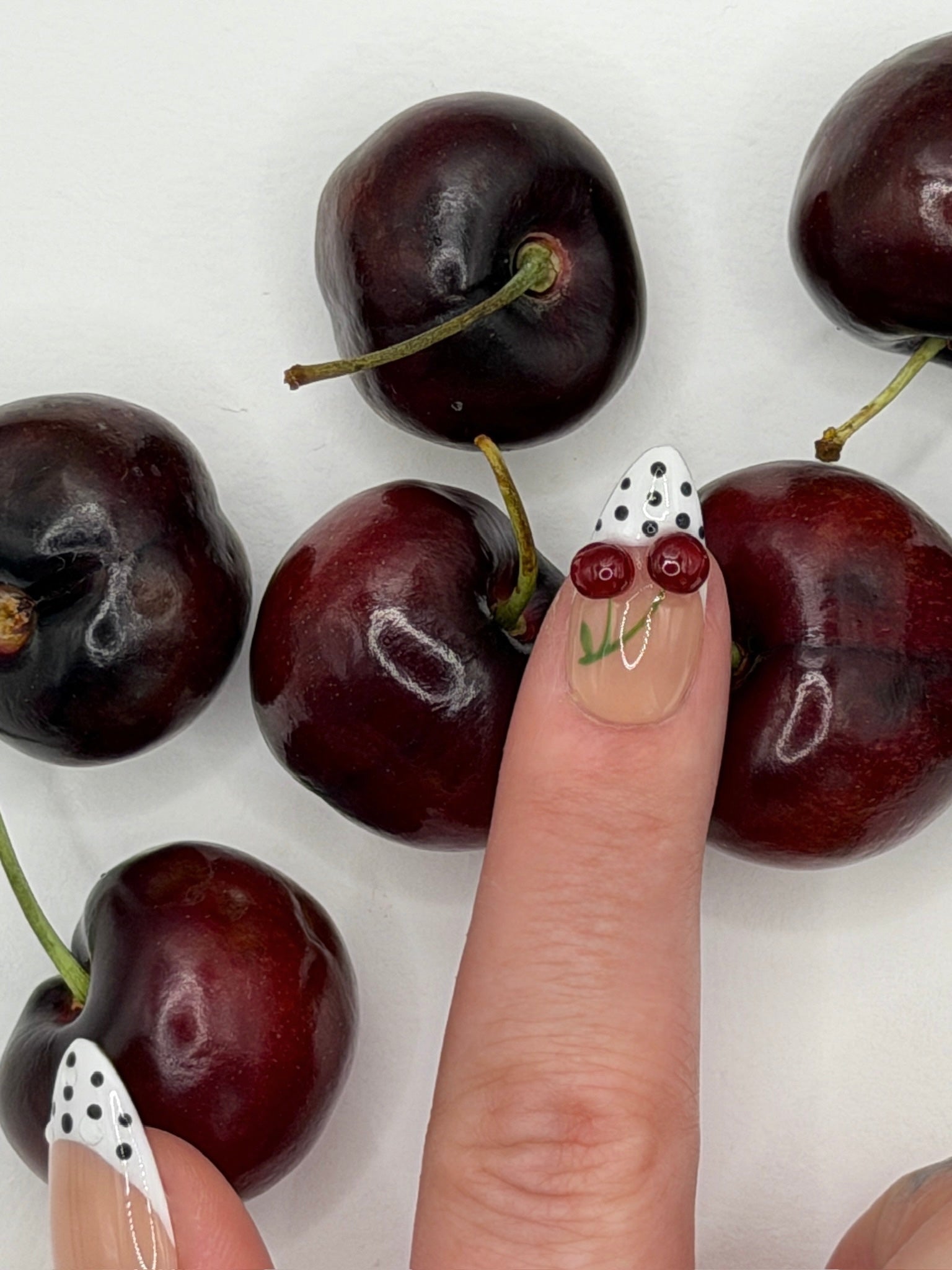 Nude base with white polka dot French tips and handcrafted 3D cherries in medium almond. The finishing touch of clear drops of dew make everything even better.