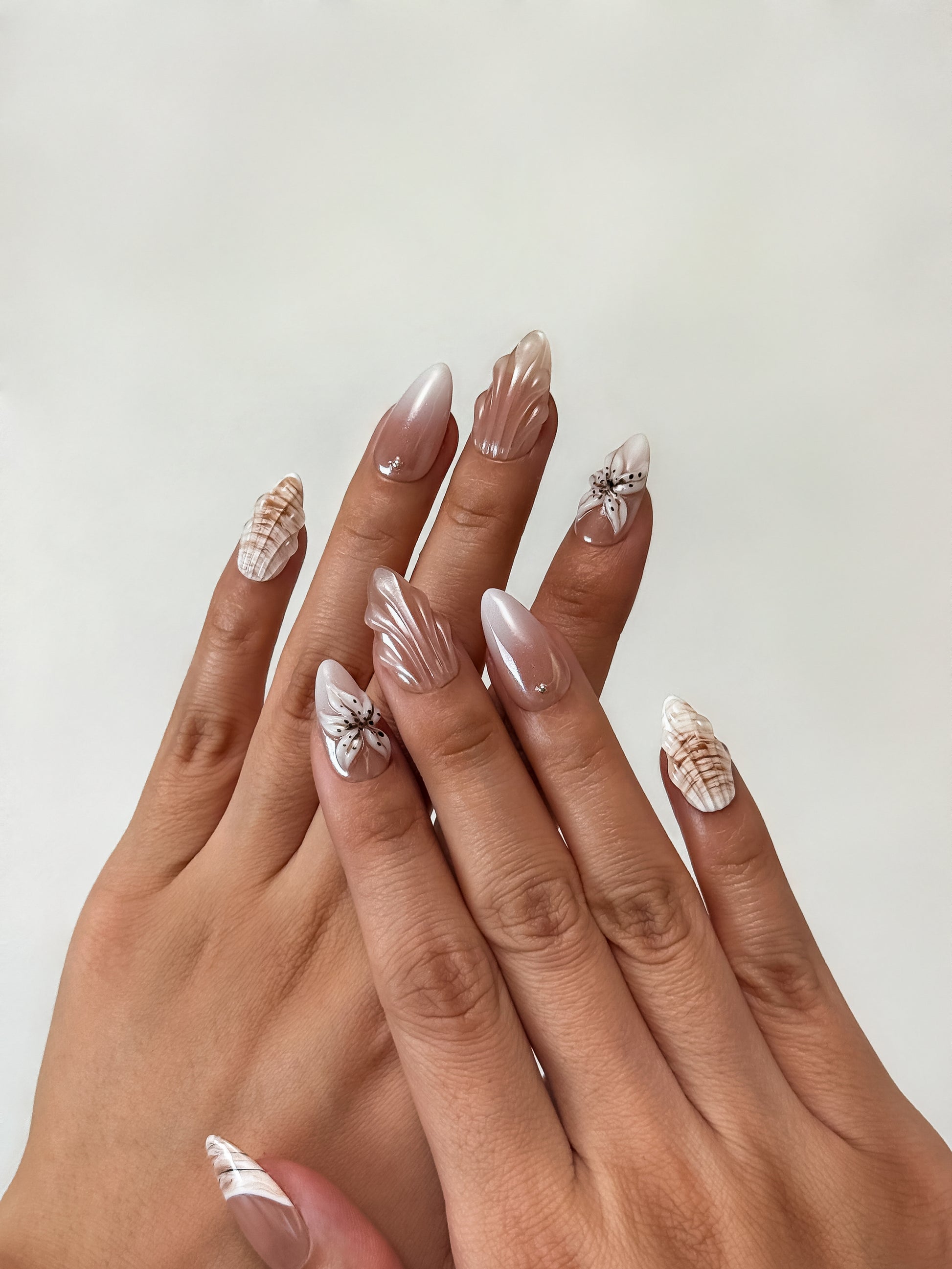 Soft milky pink and creamy nude adorned with hand-painted 3D white flowers, beaded centres, textured shell patterns, and delicate palm-inspired stripes.