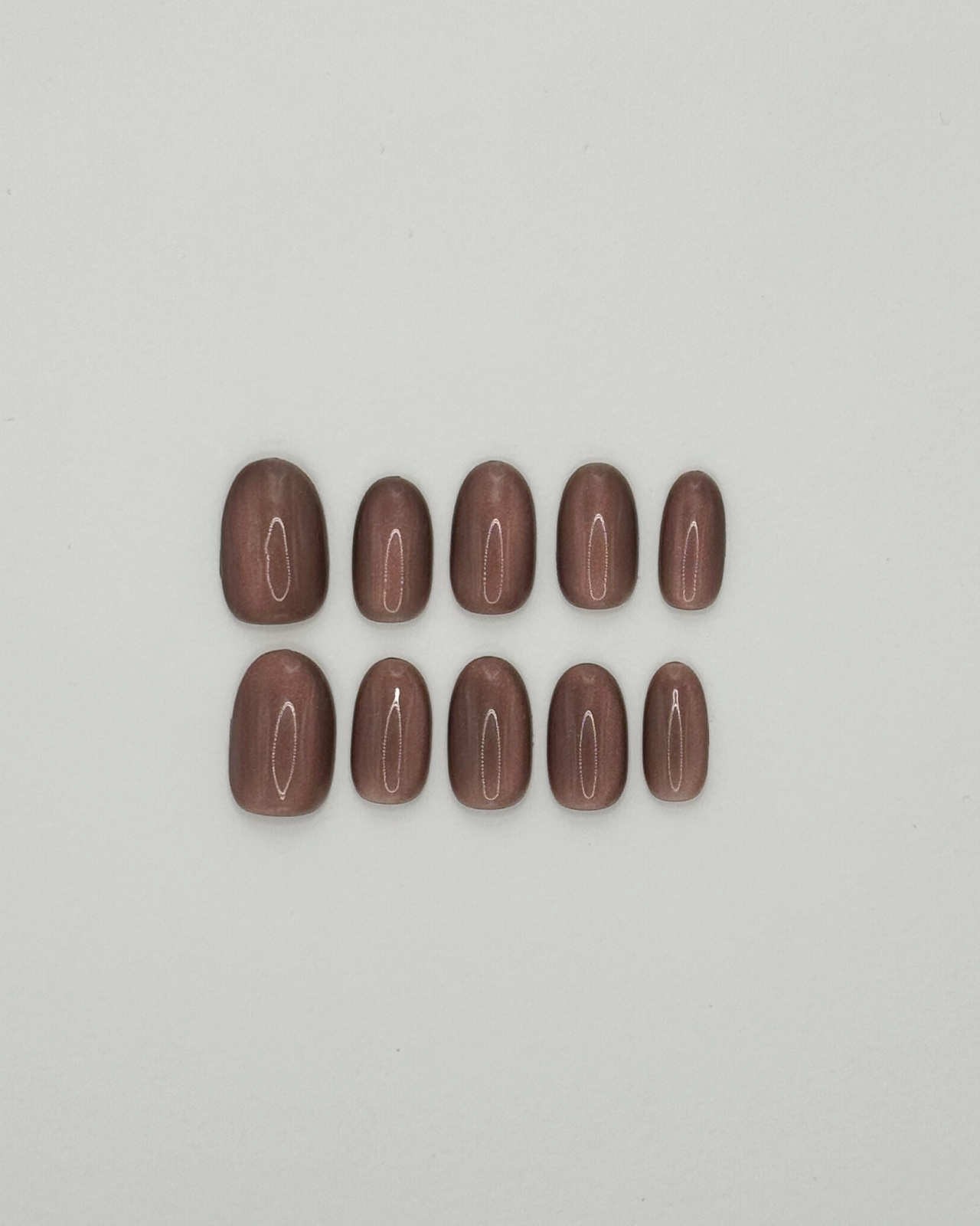 The perfect nude with a secret. This rich, coffee-kissed cateye catches light like your favorite morning ritual - subtle and sophisticated by day, absolutely luminous by night under city lights. Short oval perfection that works as hard as you do, from boardroom to bar. Some classics never go out of style.