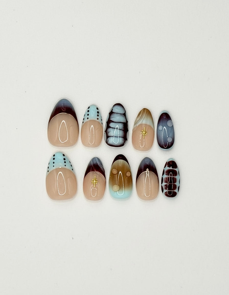 Mixed set with coffee-shade tips, blue polka dots, tortoiseshell, and gold accents in short almond. Handcrafted, reusable luxury.