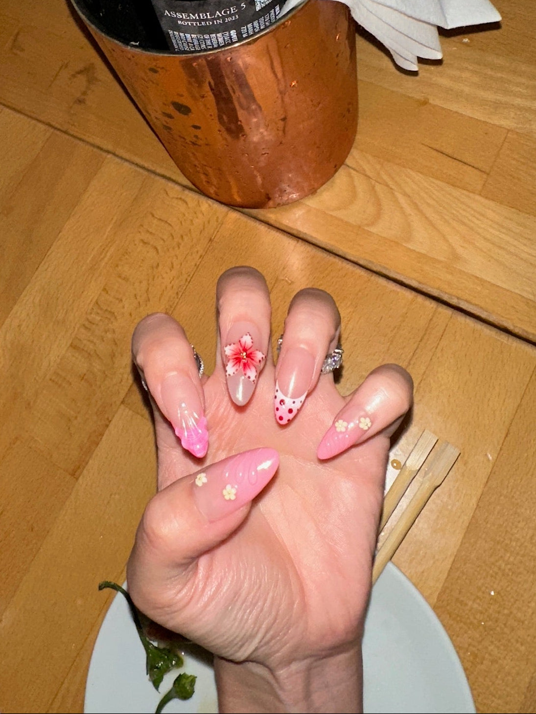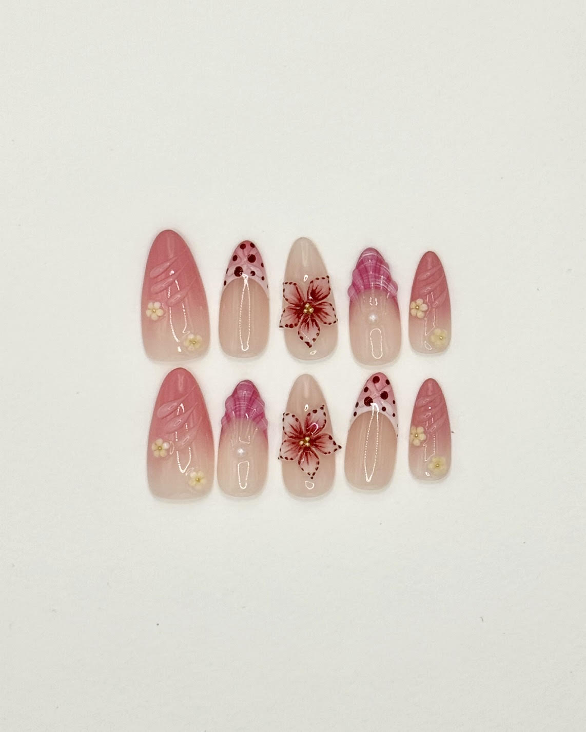 Pink gradient with handcrafted 3D florals, patterns, pearls, and gold accents in medium almond. Reusable sweet luxury.