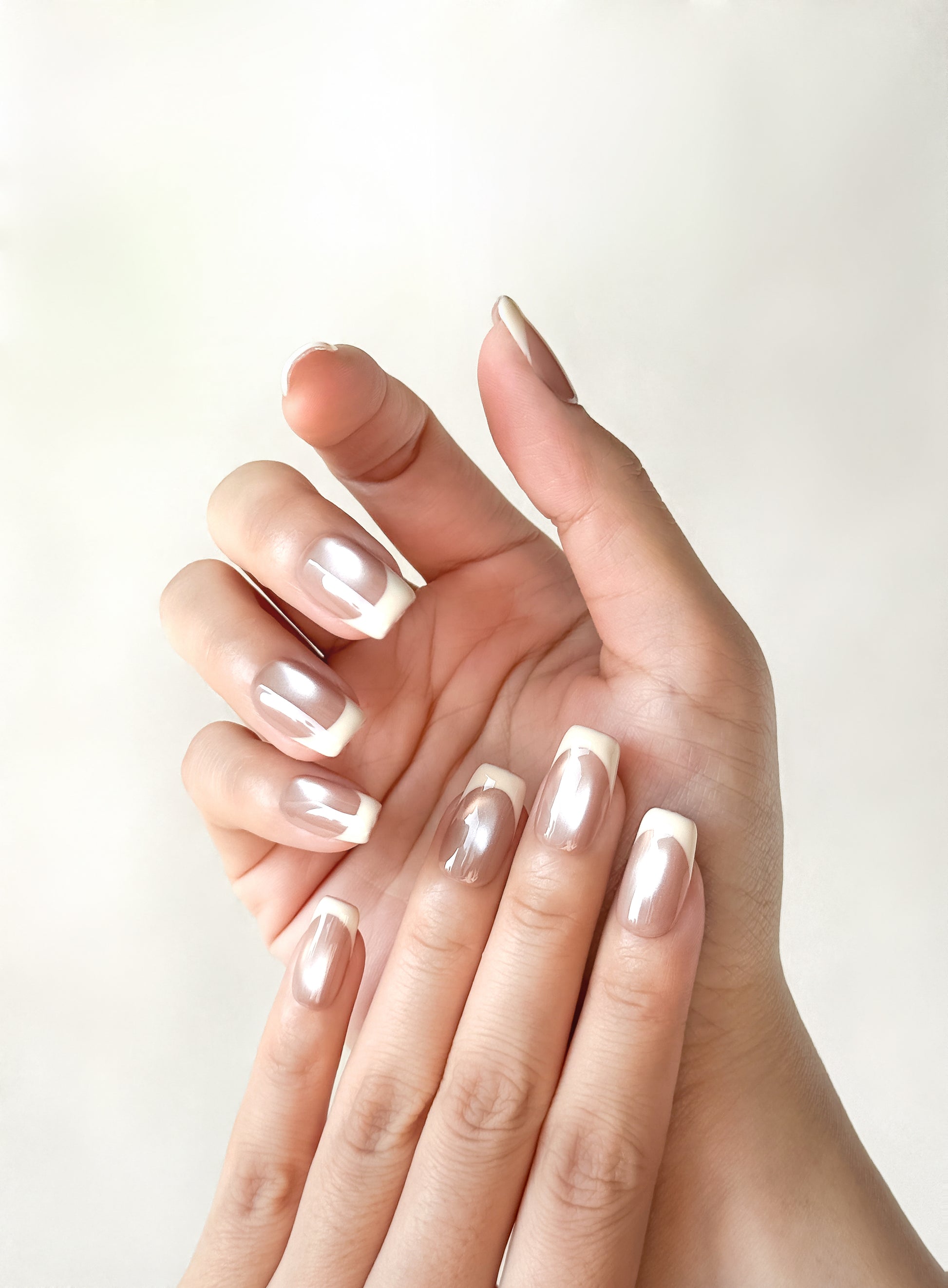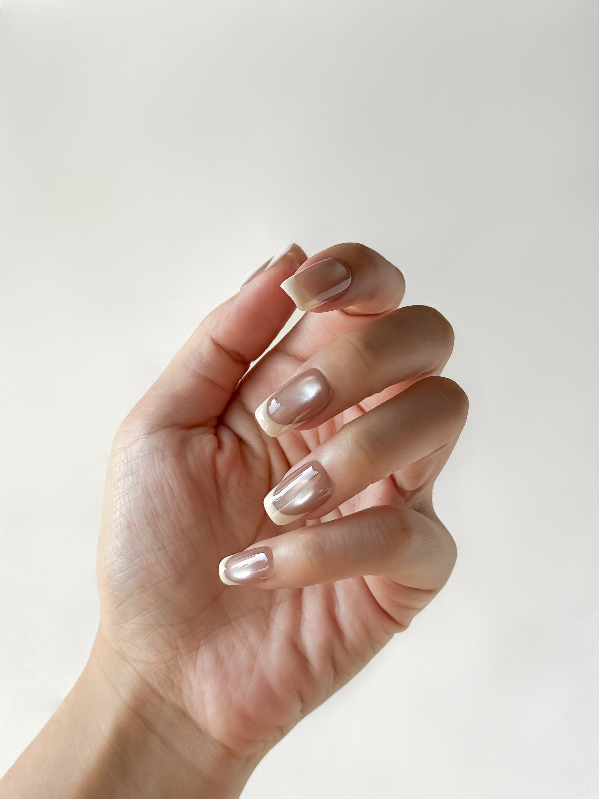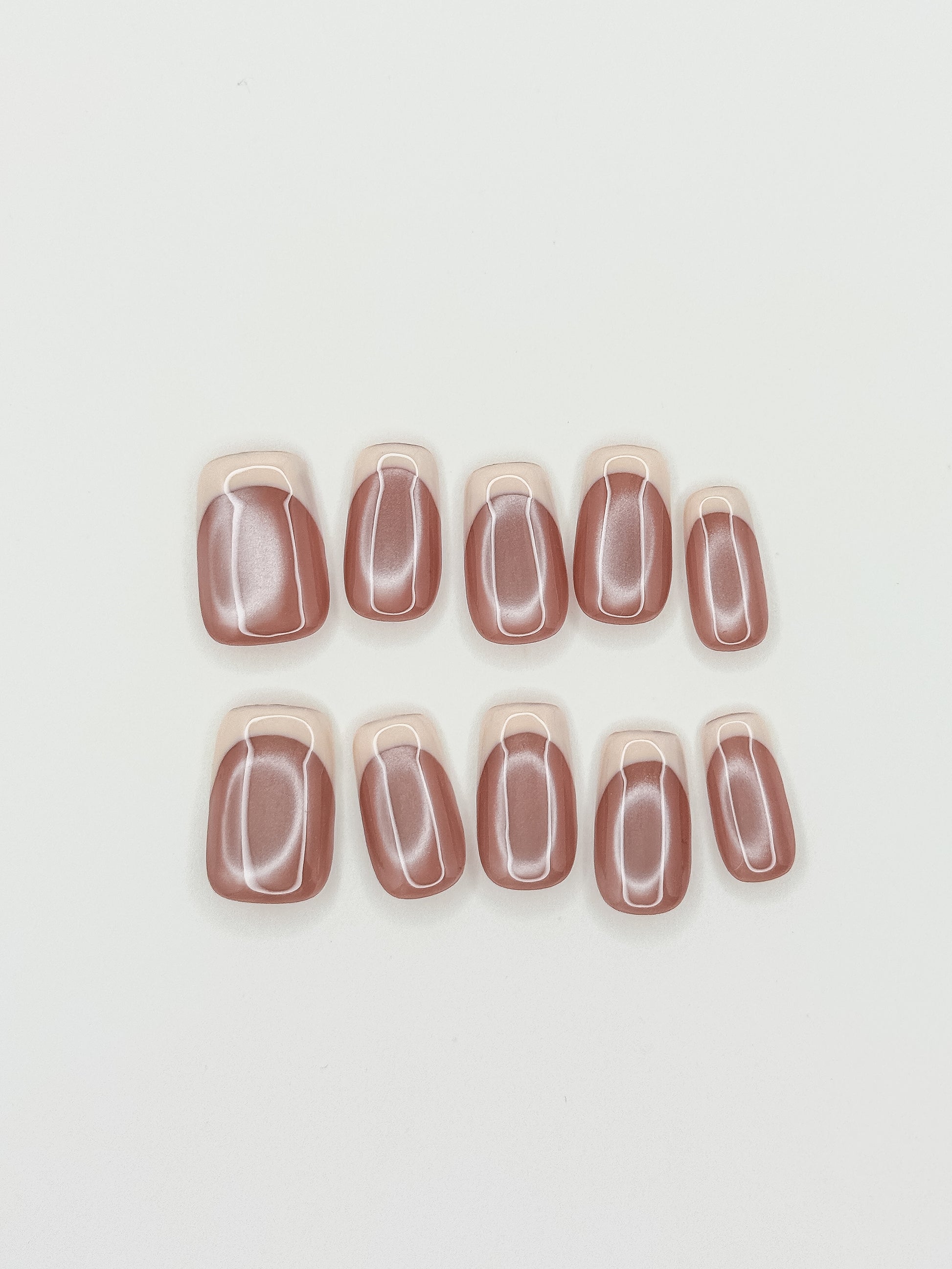Warm nude cateye base with milky-white tips curved into soft, rounded arches - like glazed donuts fresh from the oven. Modern french with a sweet twist.