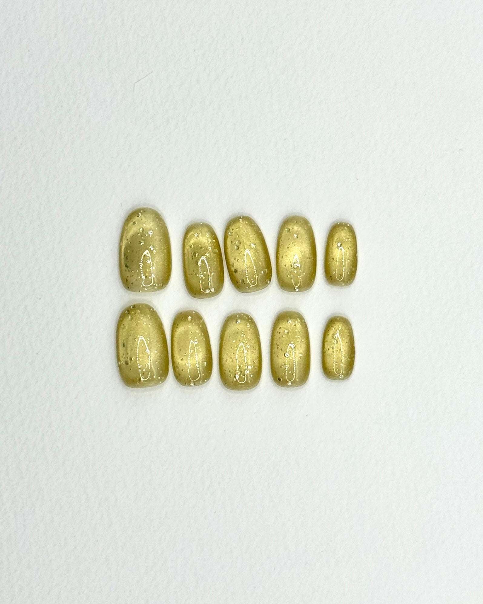 Part of Fette's festive collection inspired by our favourite drinks - Gold-yellow shimmer cateye (more vibrant compared to our orange-tinted Mimosa style) with sparkle accents in medium oval. Reusable champagne luxury.