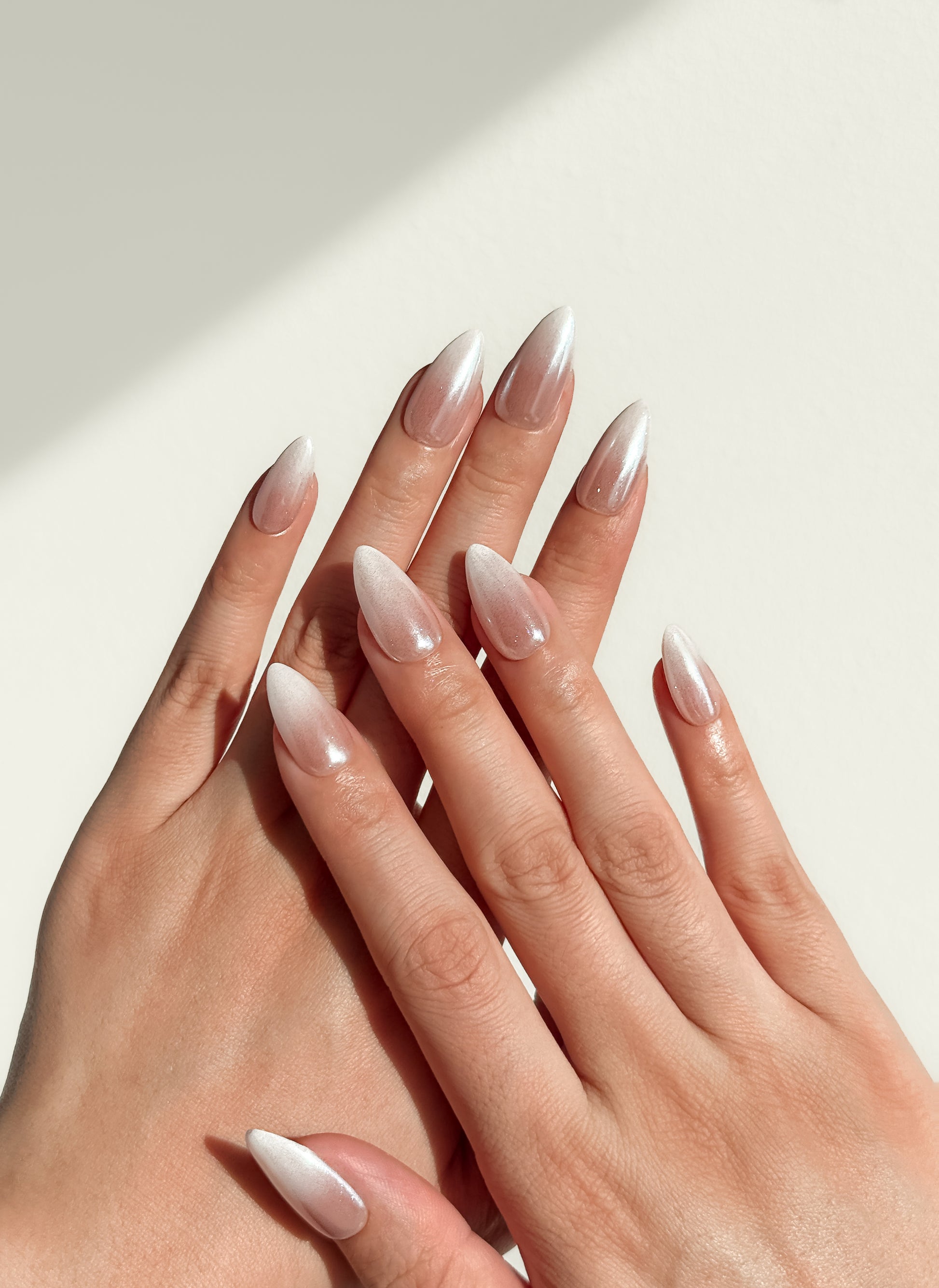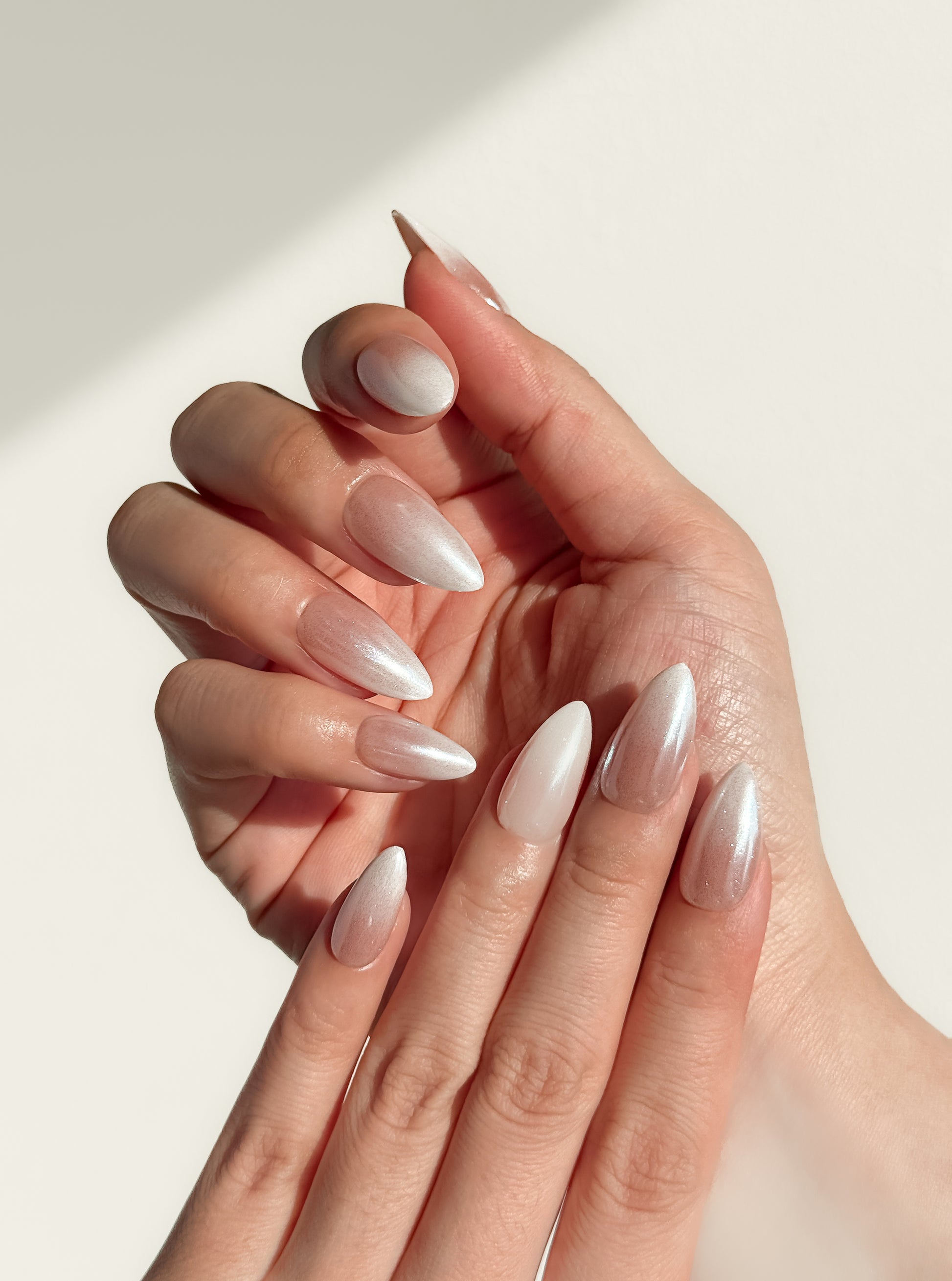 Milky pinky beige melting into shimmering white - like frost on a windowpane at dawn. Delicate shimmer catches the light with every movement.