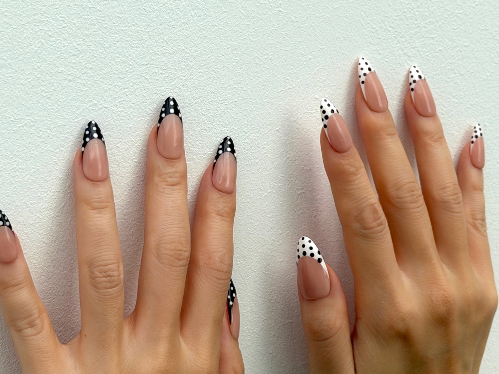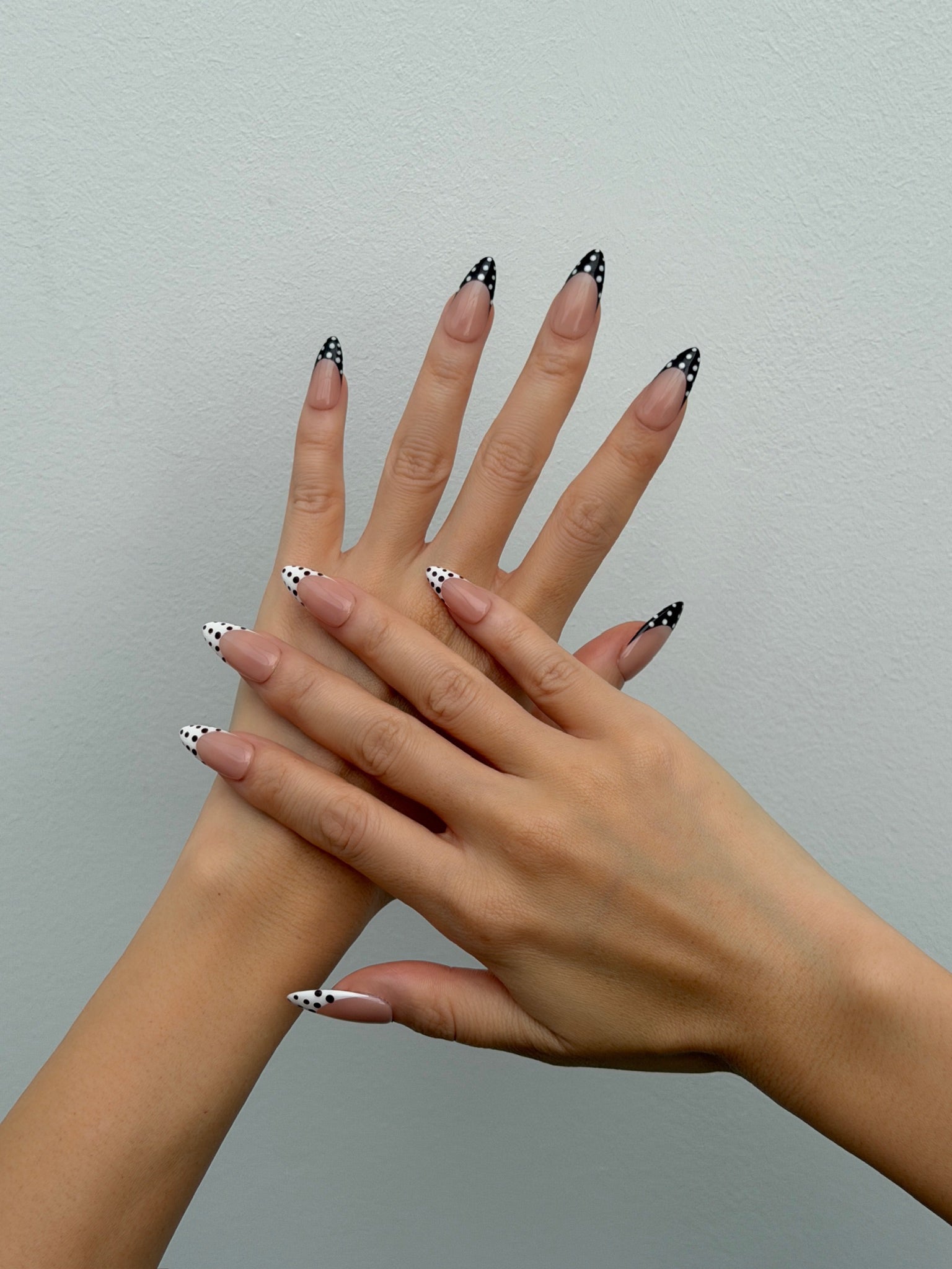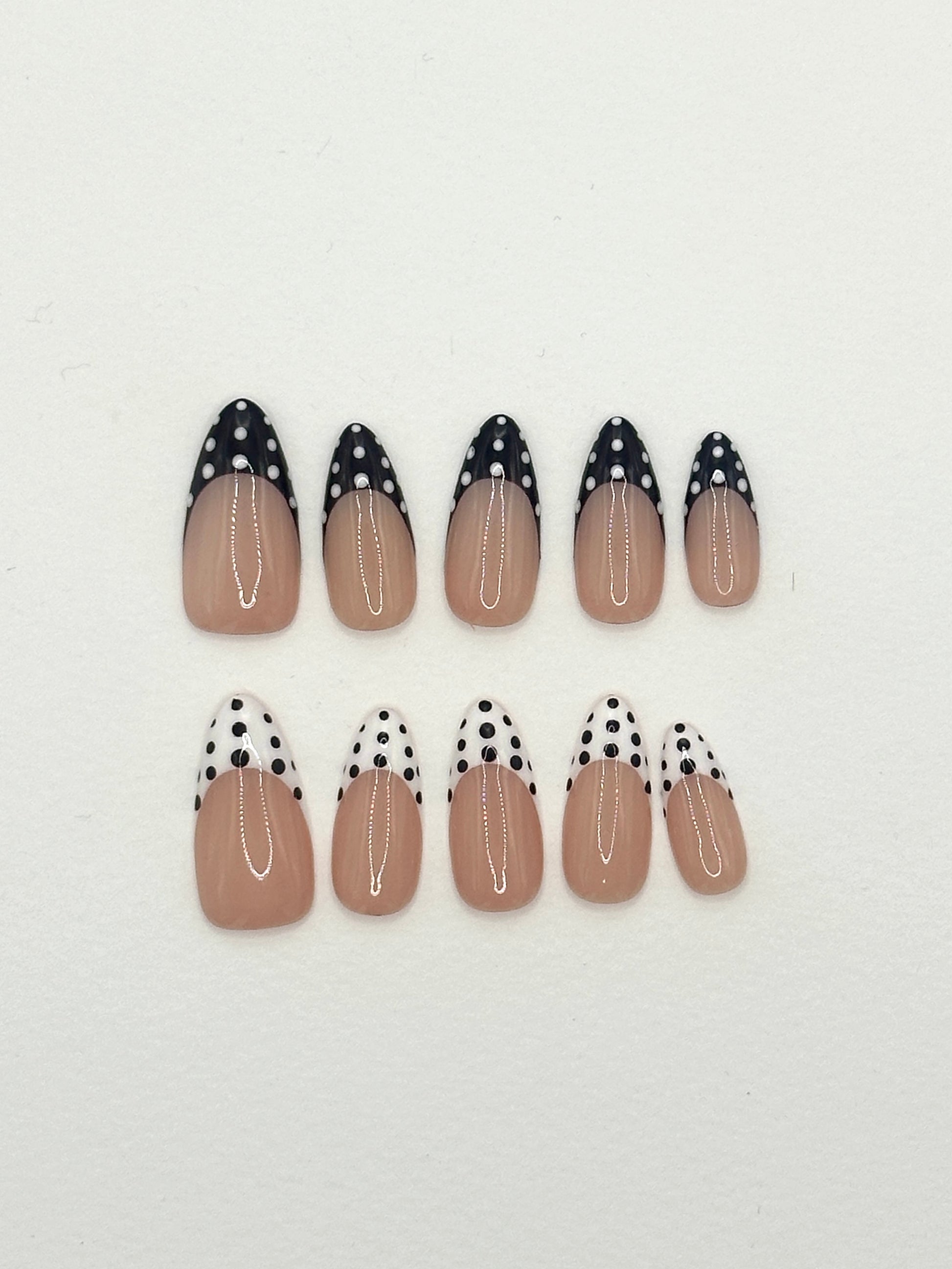 Rich coffee brown and white polka dot French tips in medium almond. Where all the real conversations happen.
