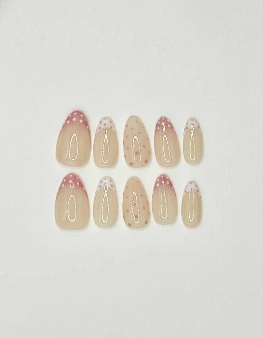 Pink polka dot French tips in short almond. Sweet meets smart, and everyone underestimates you exactly once.