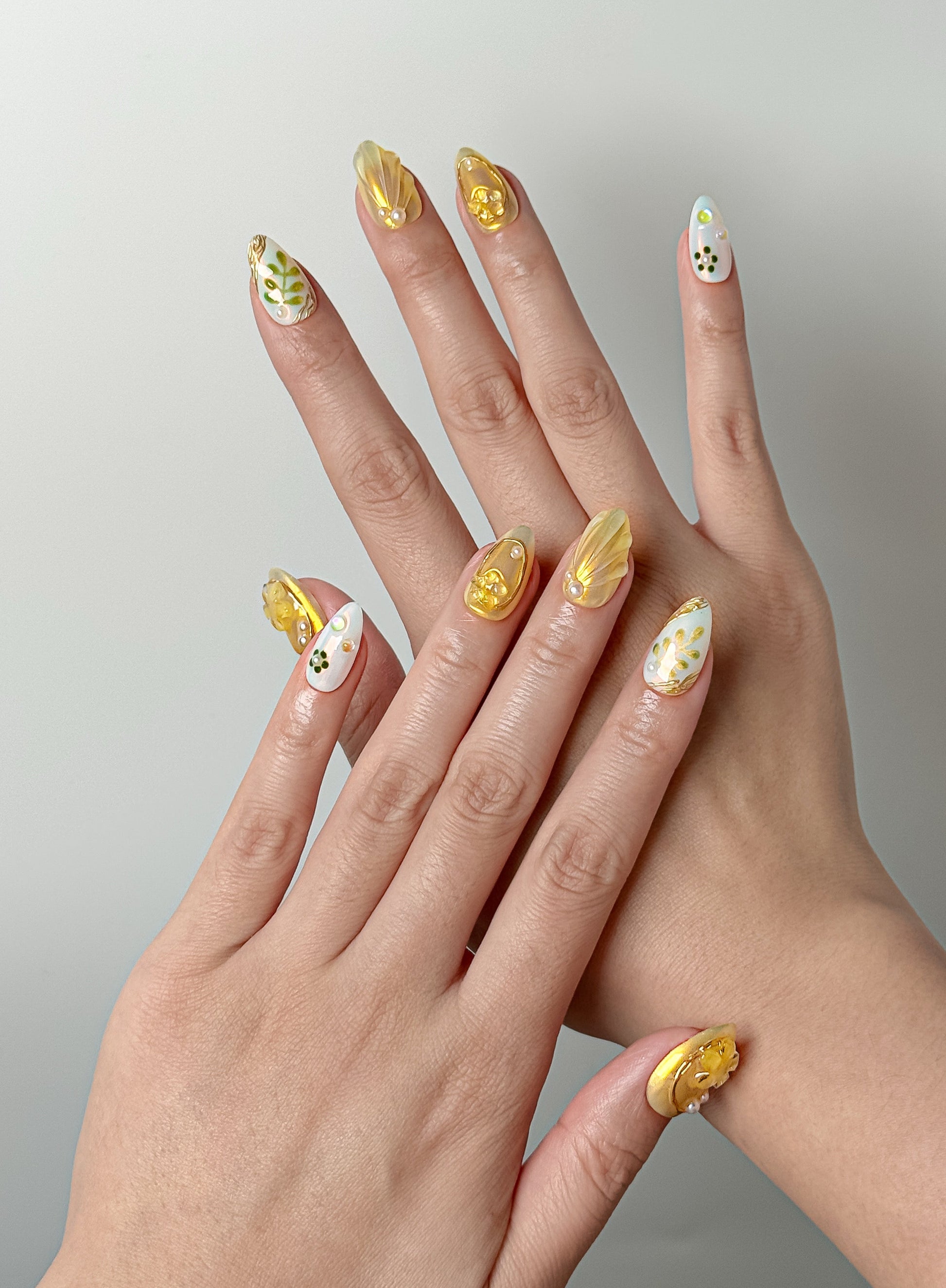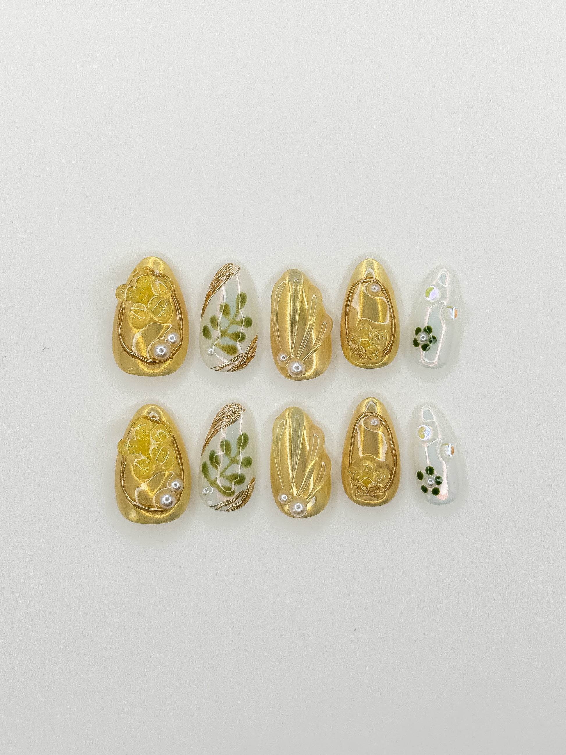 Mixed set with golden swirls, handcrafted 3D leaves, pearls, and green polka dots in short almond. Reusable golden luxury.