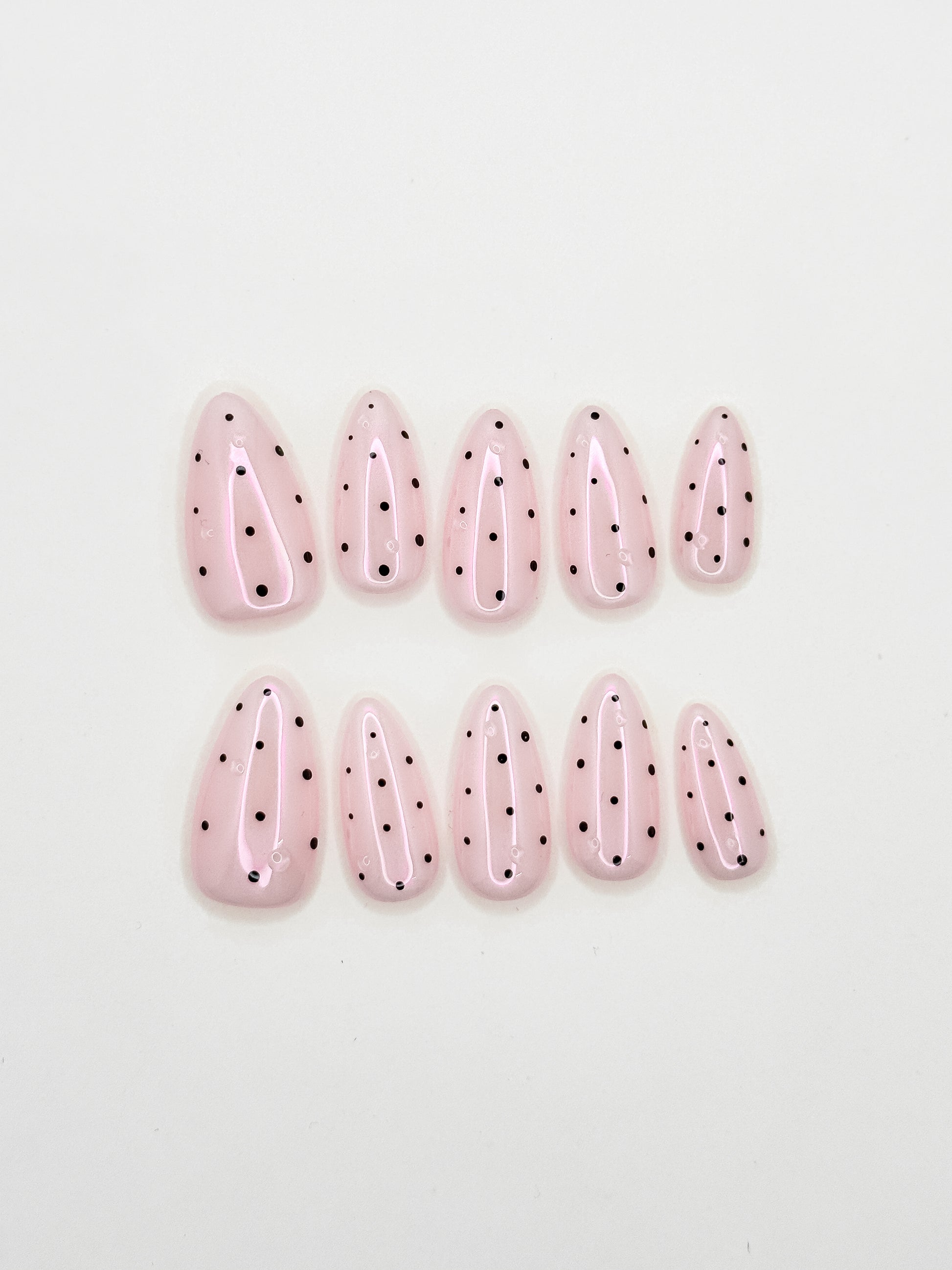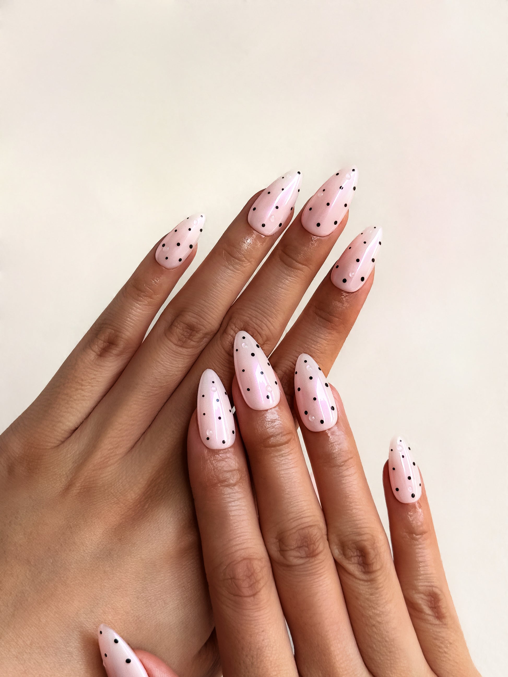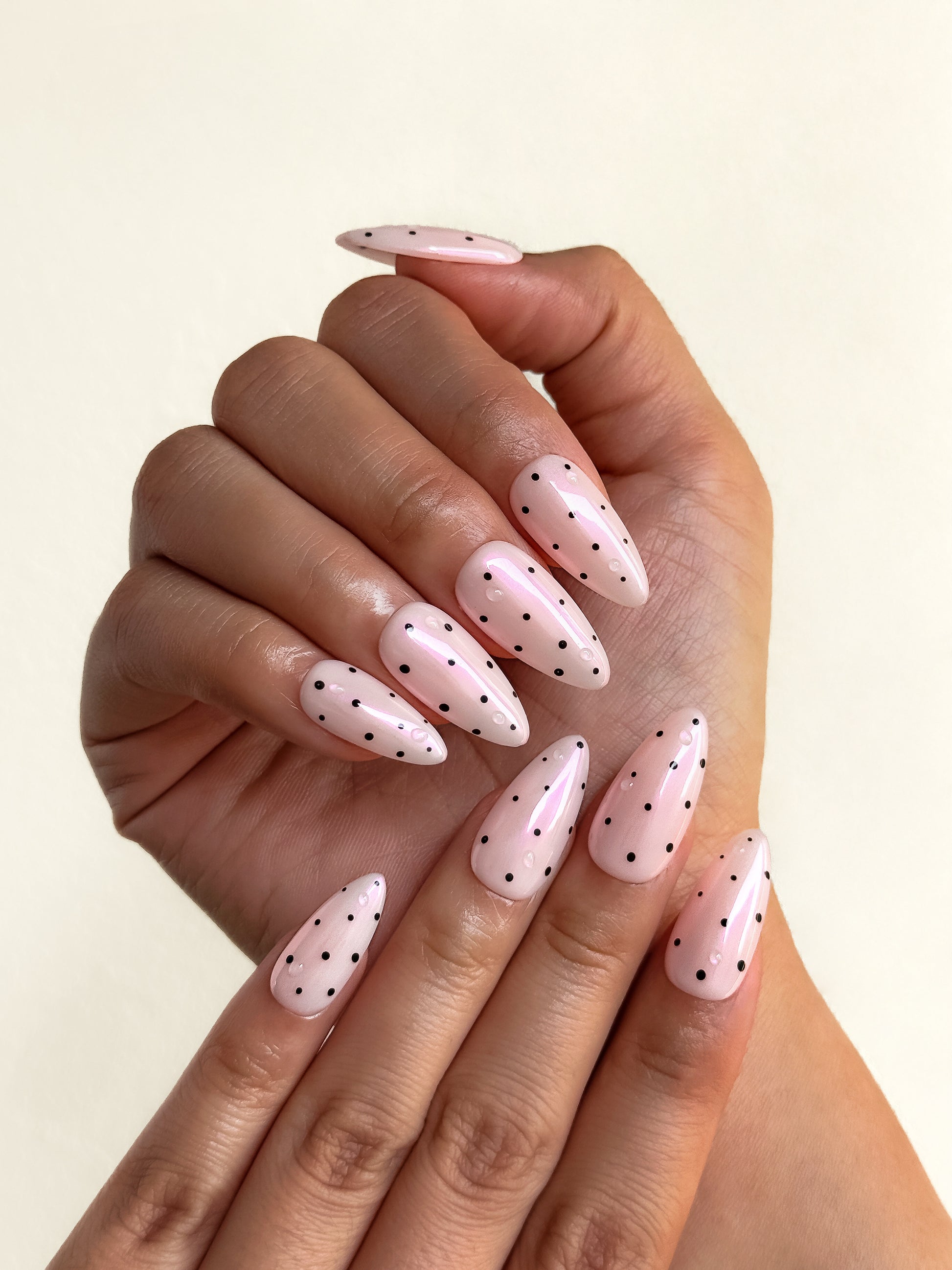 Delicate black polka dots scattered across a dreamy pink base, finished with glossy dew drops. Sweet, sophisticated, and perfectly Parisan. Your everyday elegance with just the right amount of je ne sais quoi.