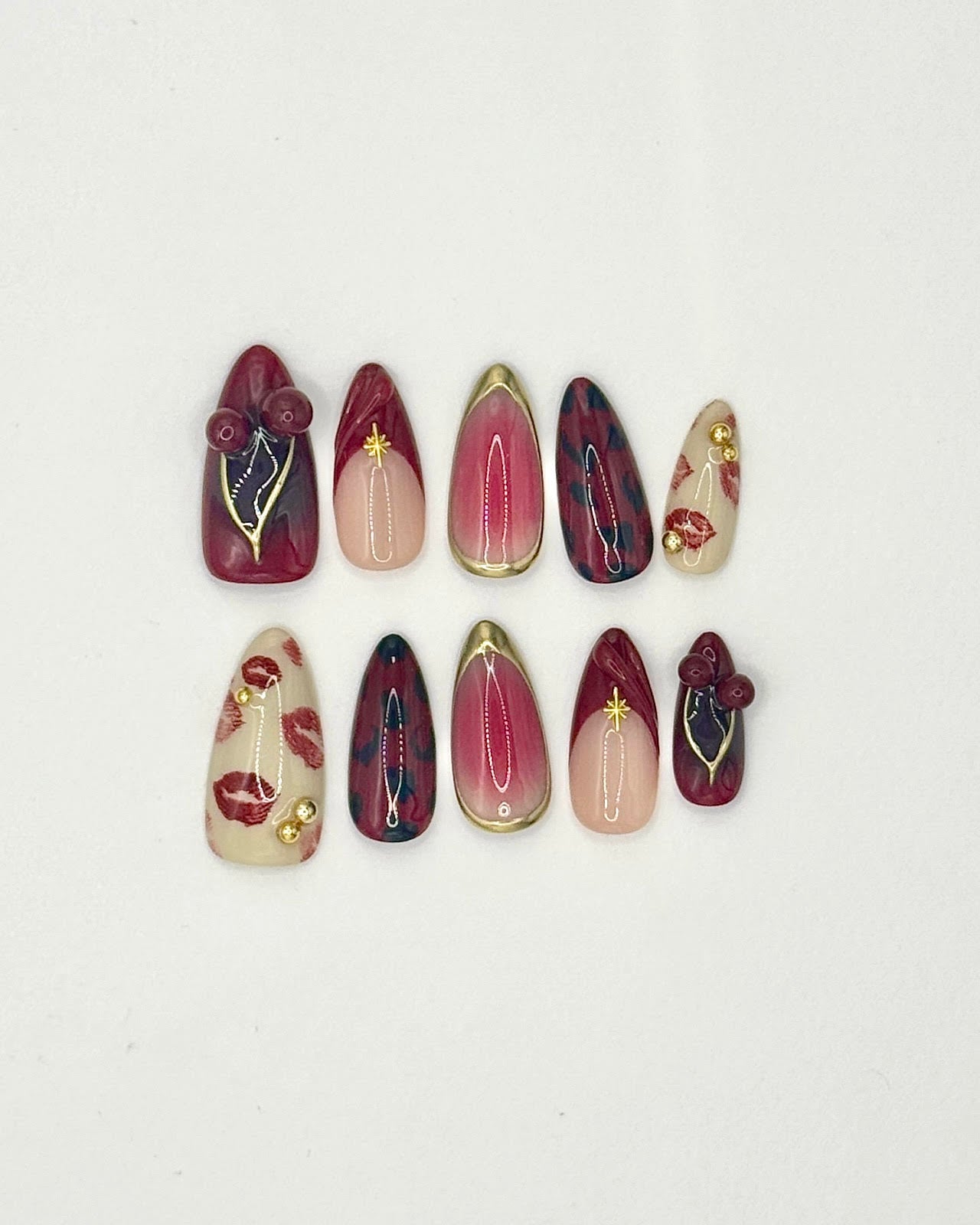 Mixed set with burgundy tones, handcrafted 3D cherries, gold accents, and intricate details in medium almond. Reusable temptation.