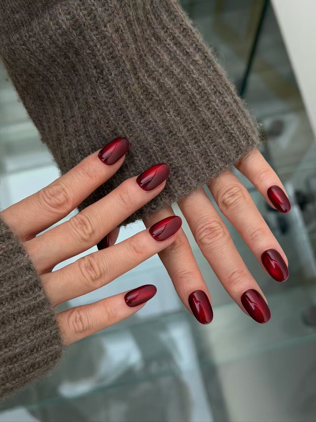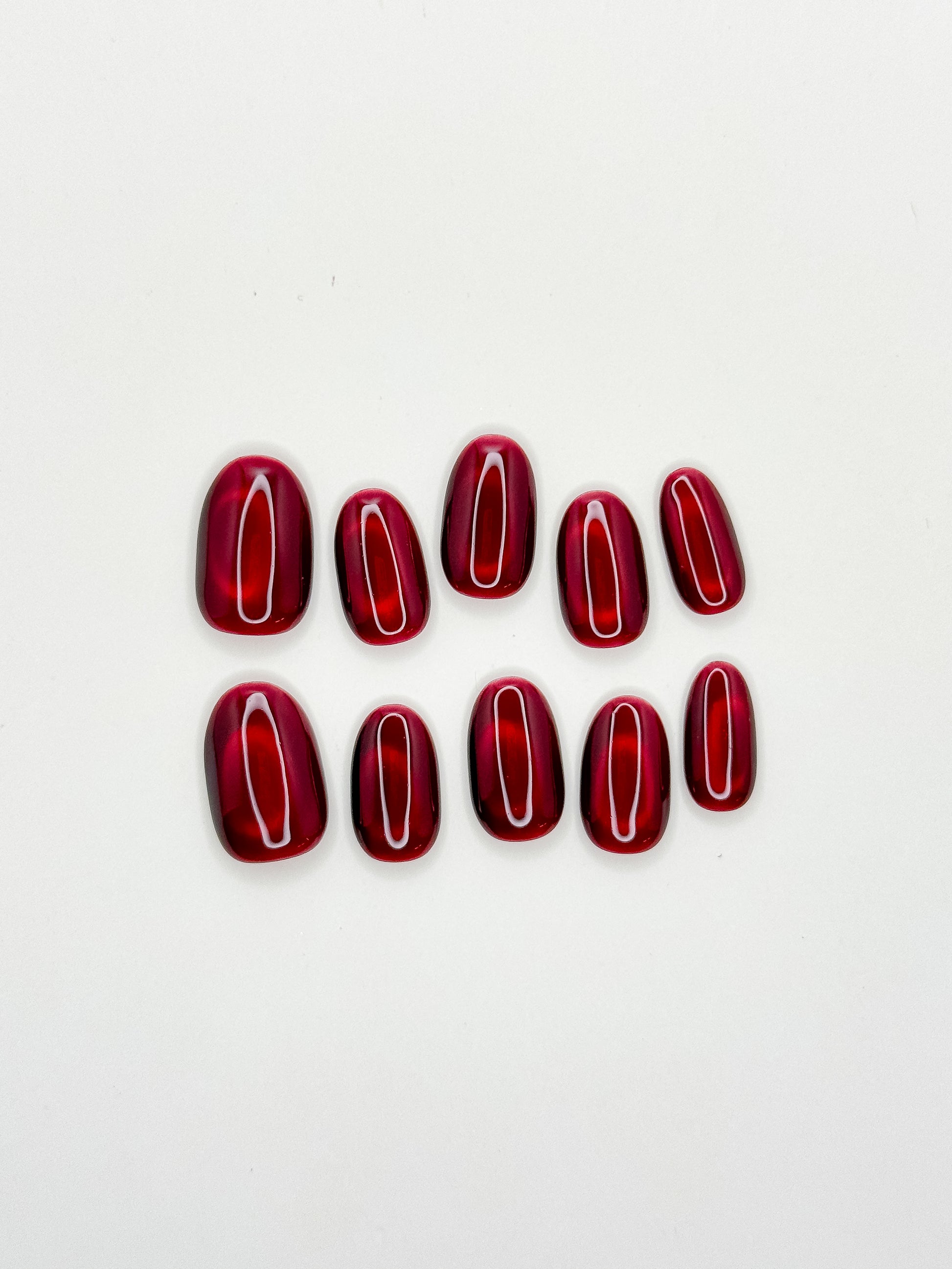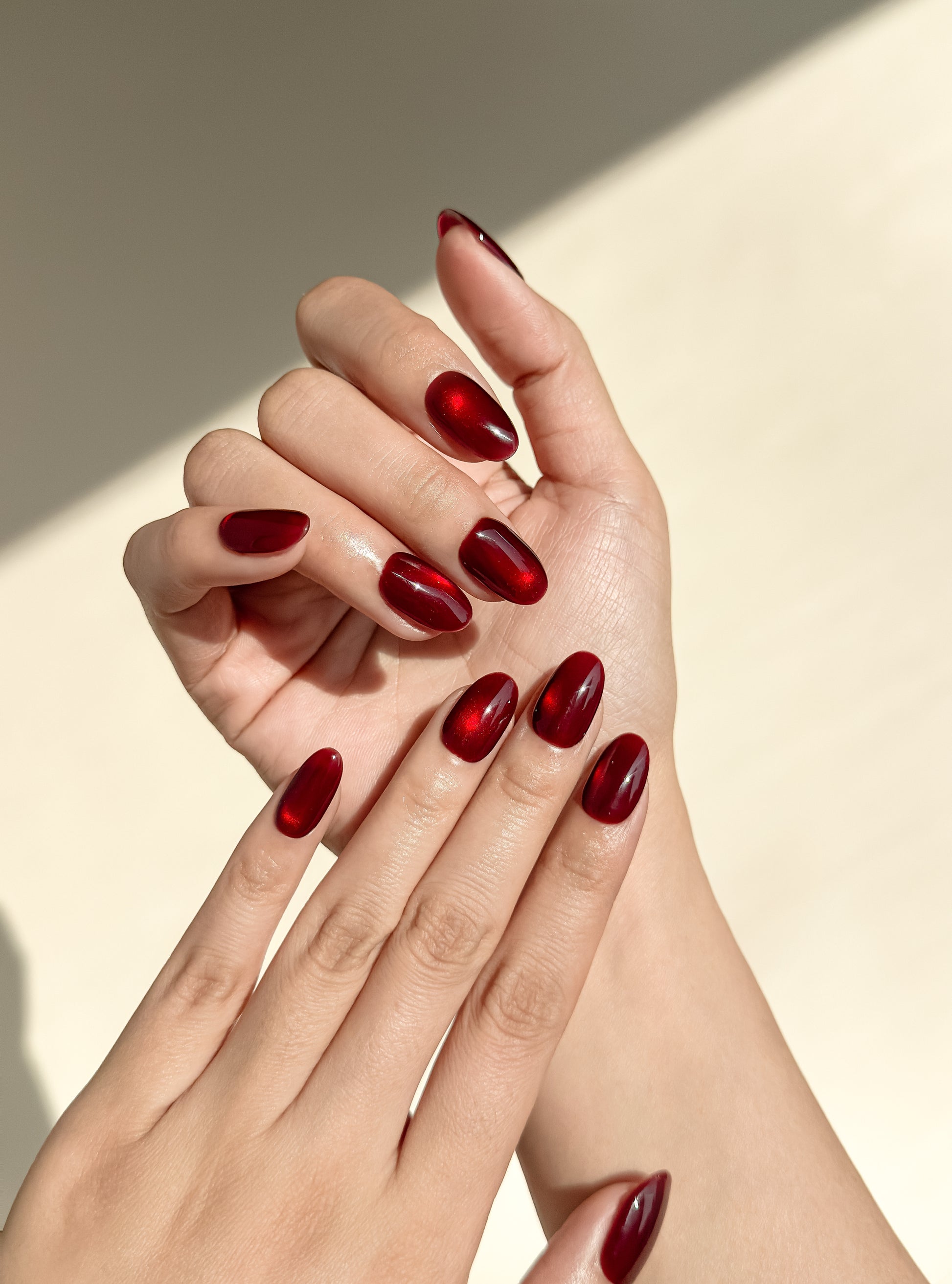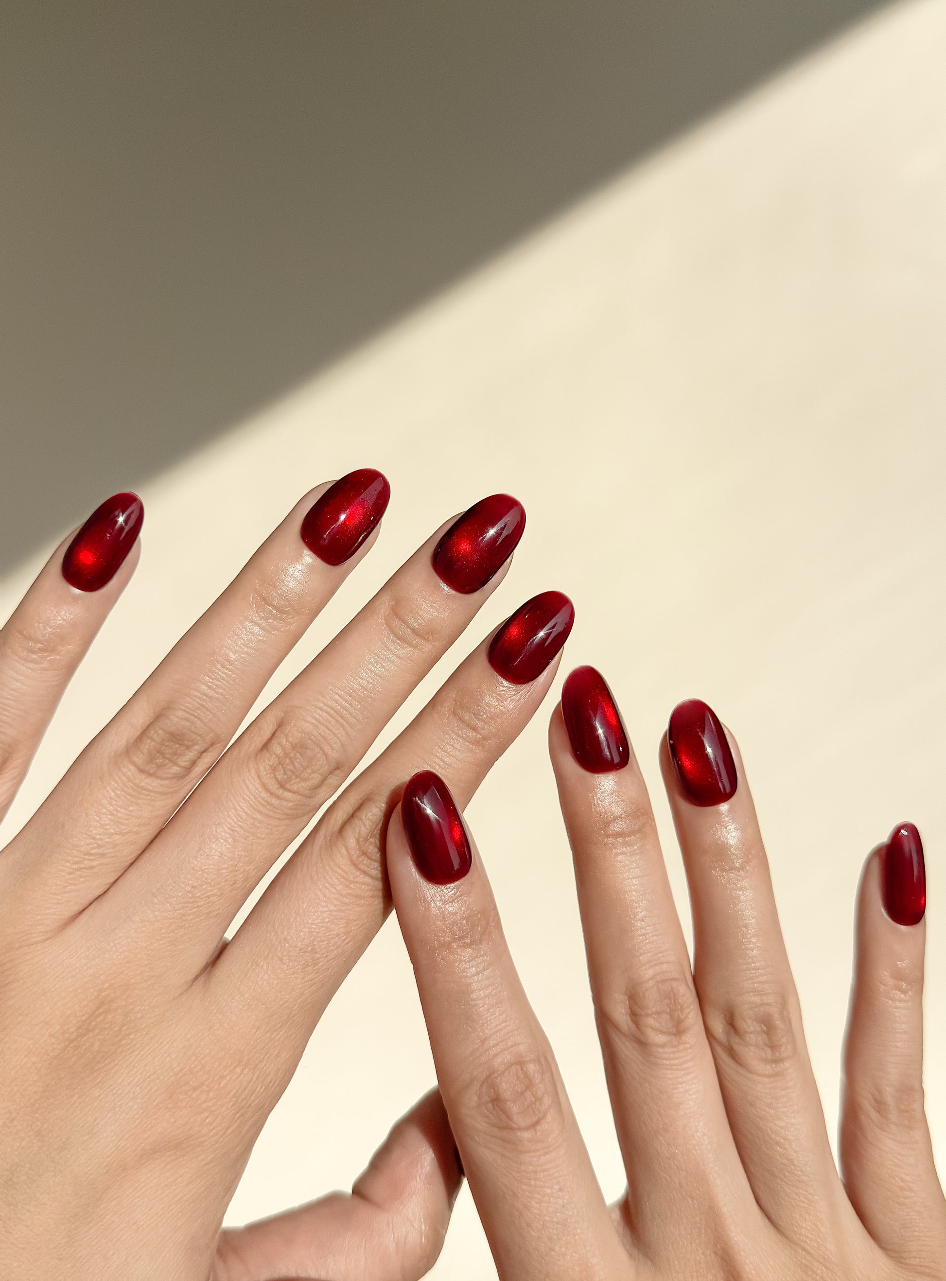 Deep, jewel-toned red with a mesmerising cat-eye shimmer that catches the light like a precious gemstone. Also available in medium almond and medium square to match your vibe.