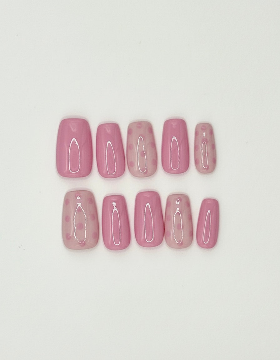 Medium square in the best shades of pink with muted polka dots. Sorority queen meets reality TV icon.