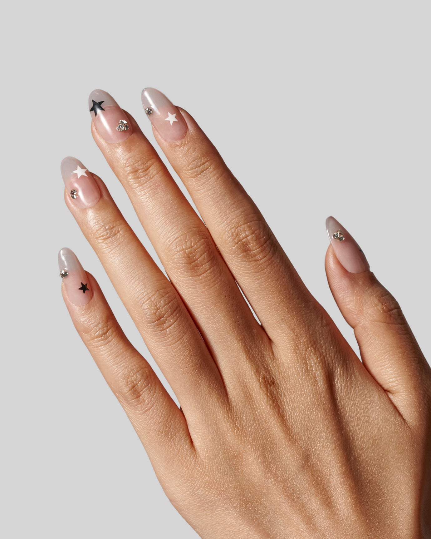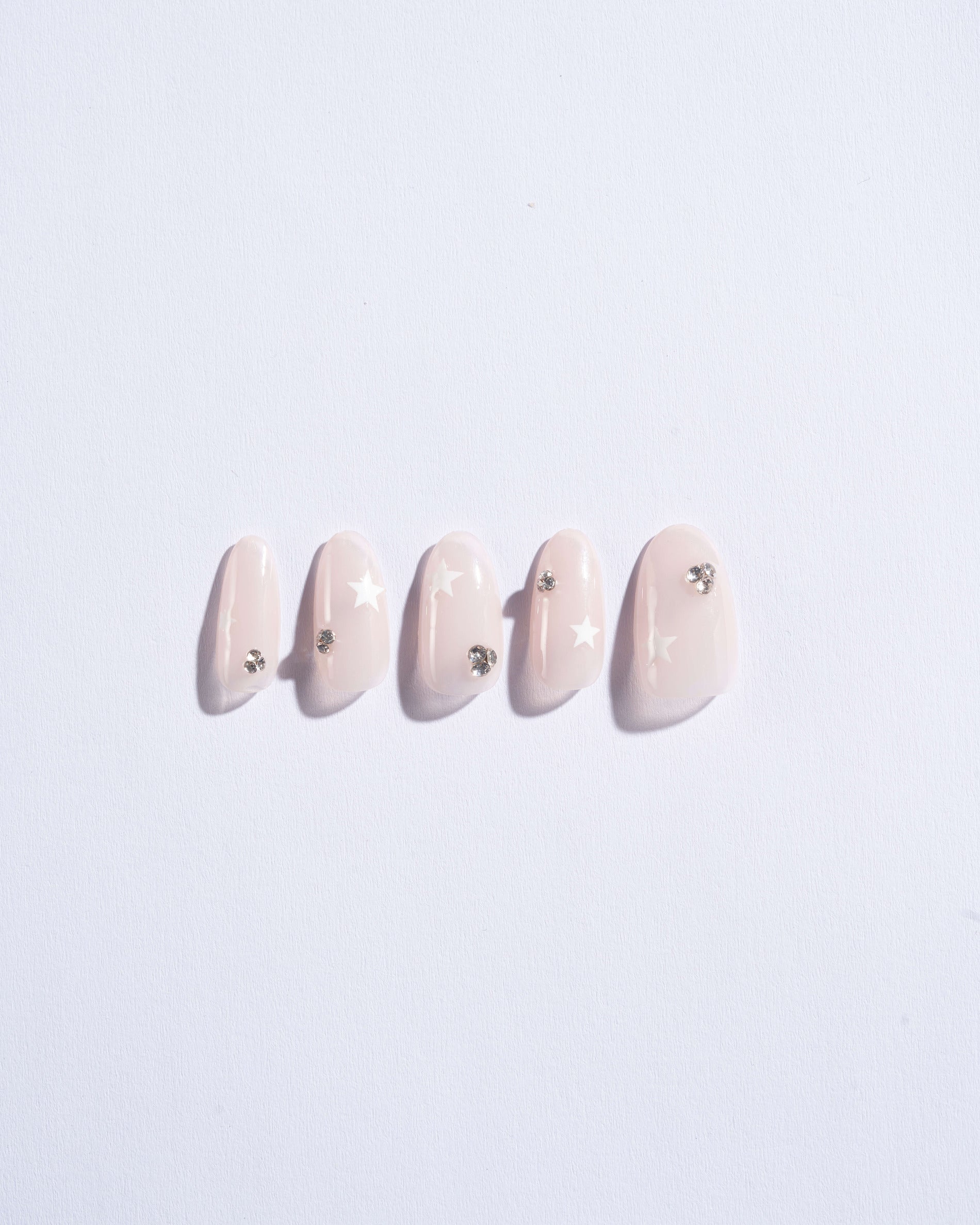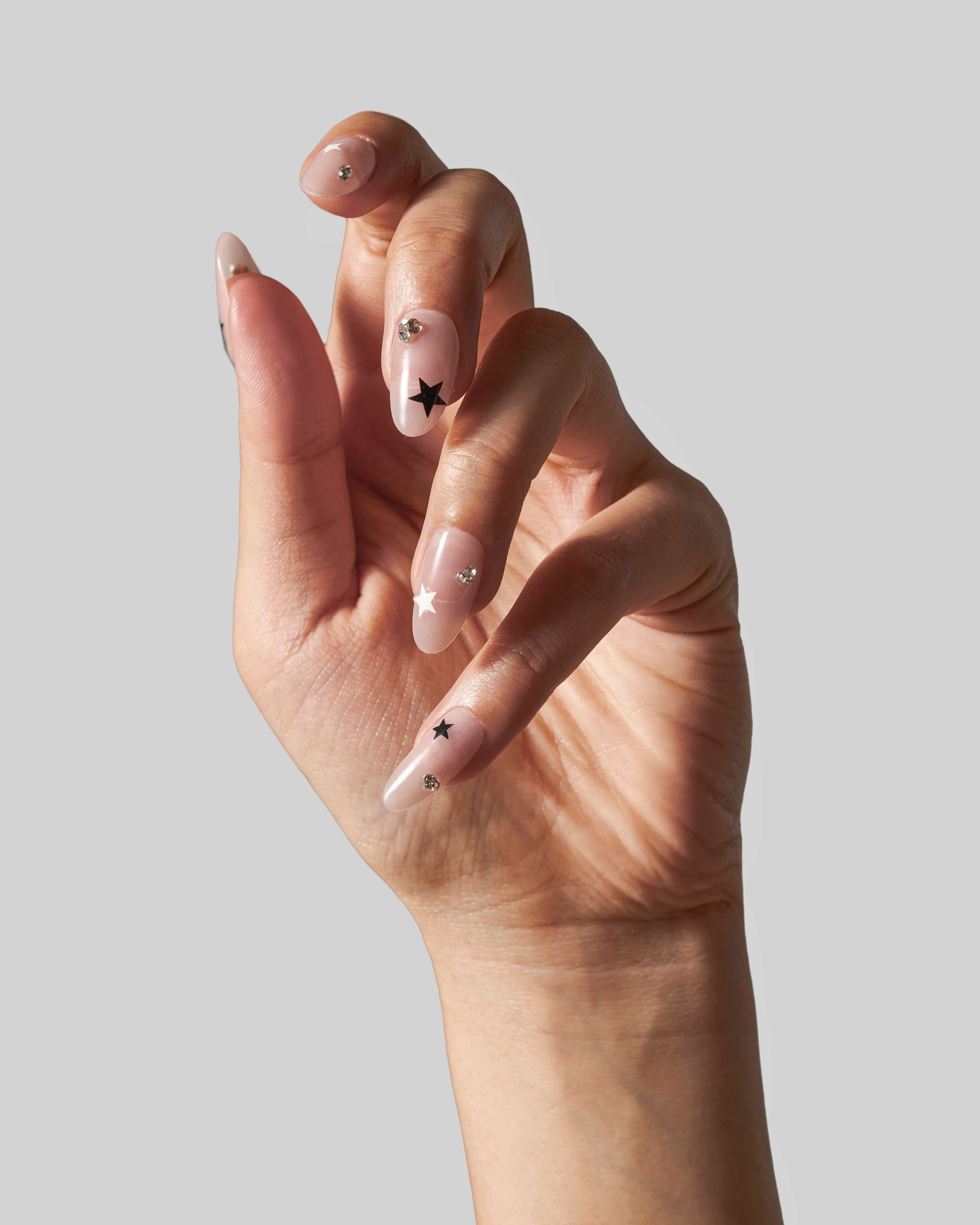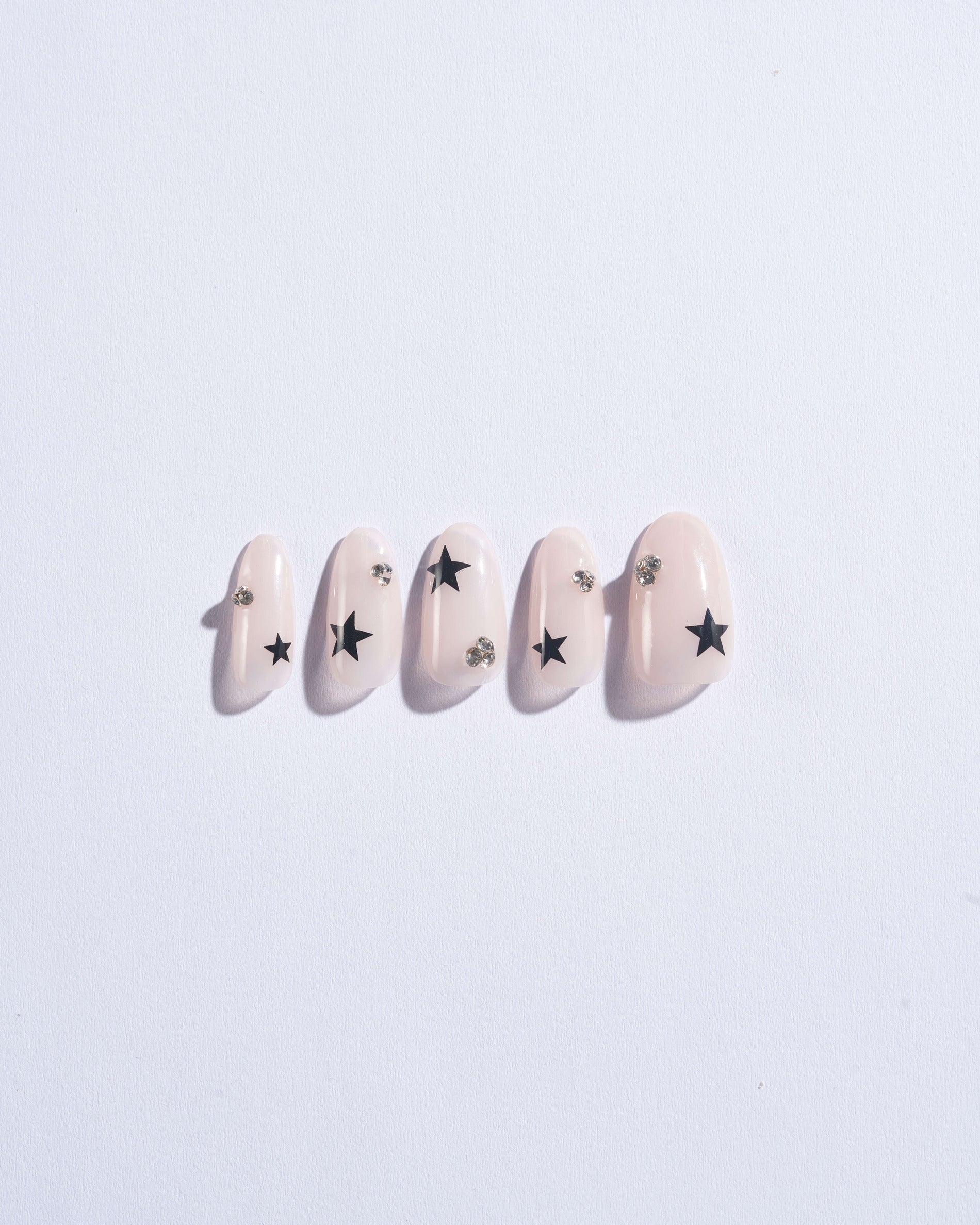 Want a nude nail with a unique touch? Introducing Starry Night. In a short, oval shaped design, these nails feature a sheer nude base, small black and white stars, and low-key crystal embellishments. With this fabulous, yet versatile set, you are good to go for every outfit and every occasion.