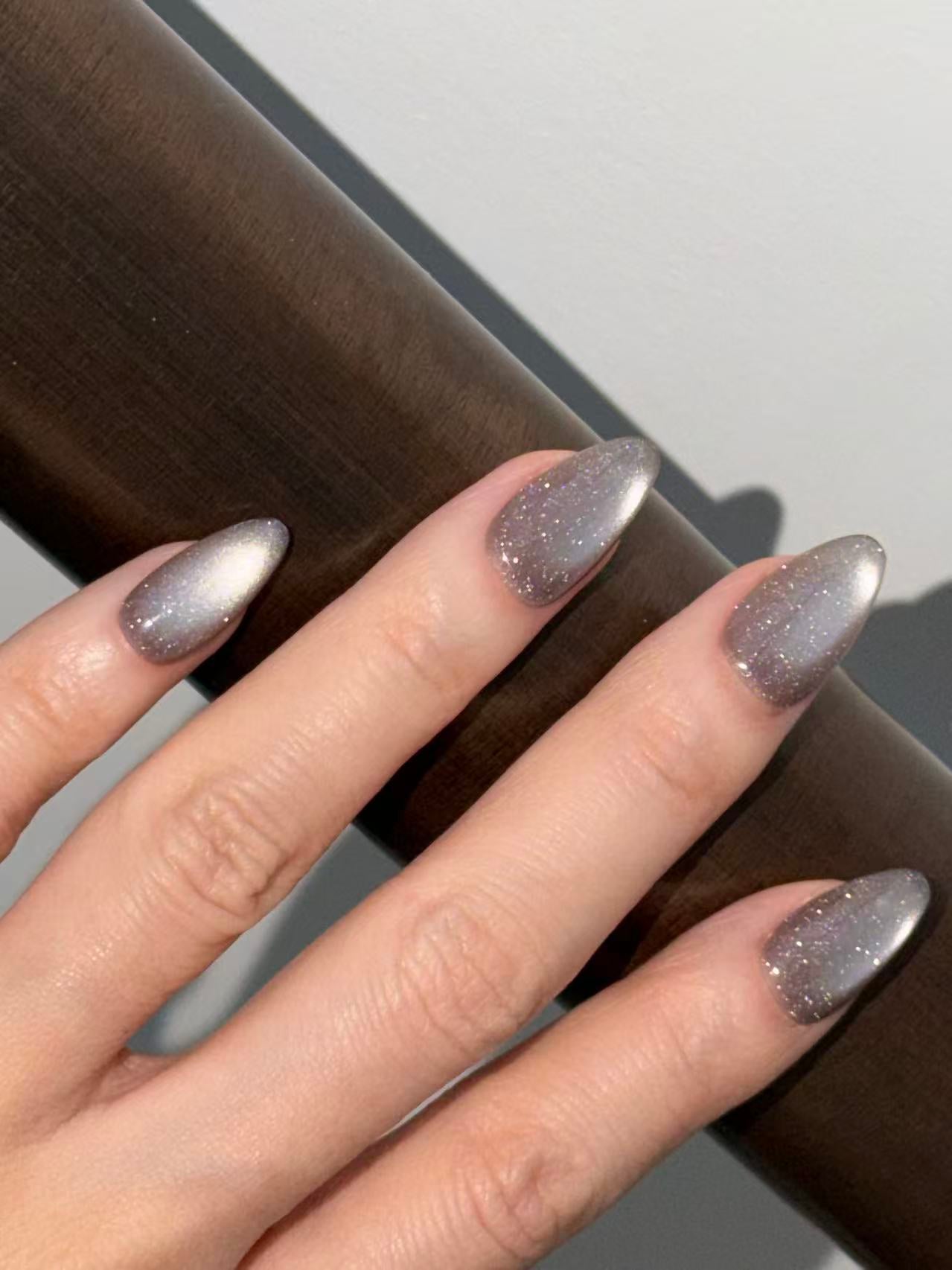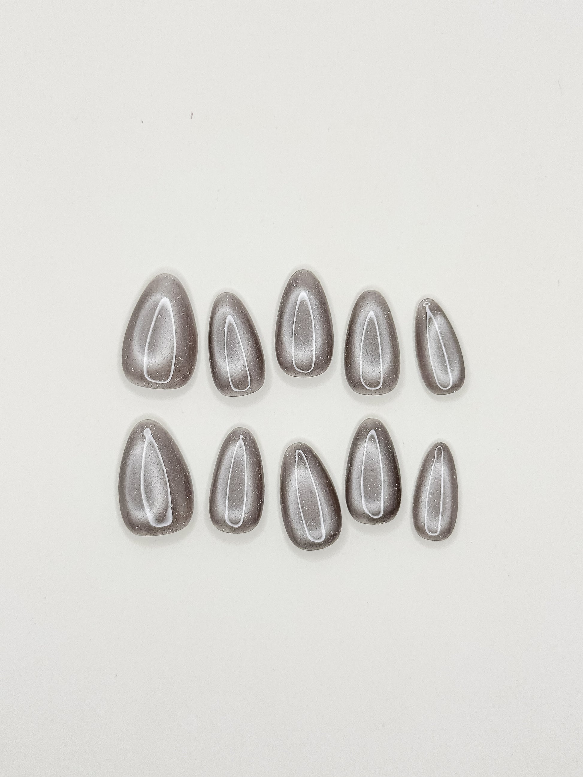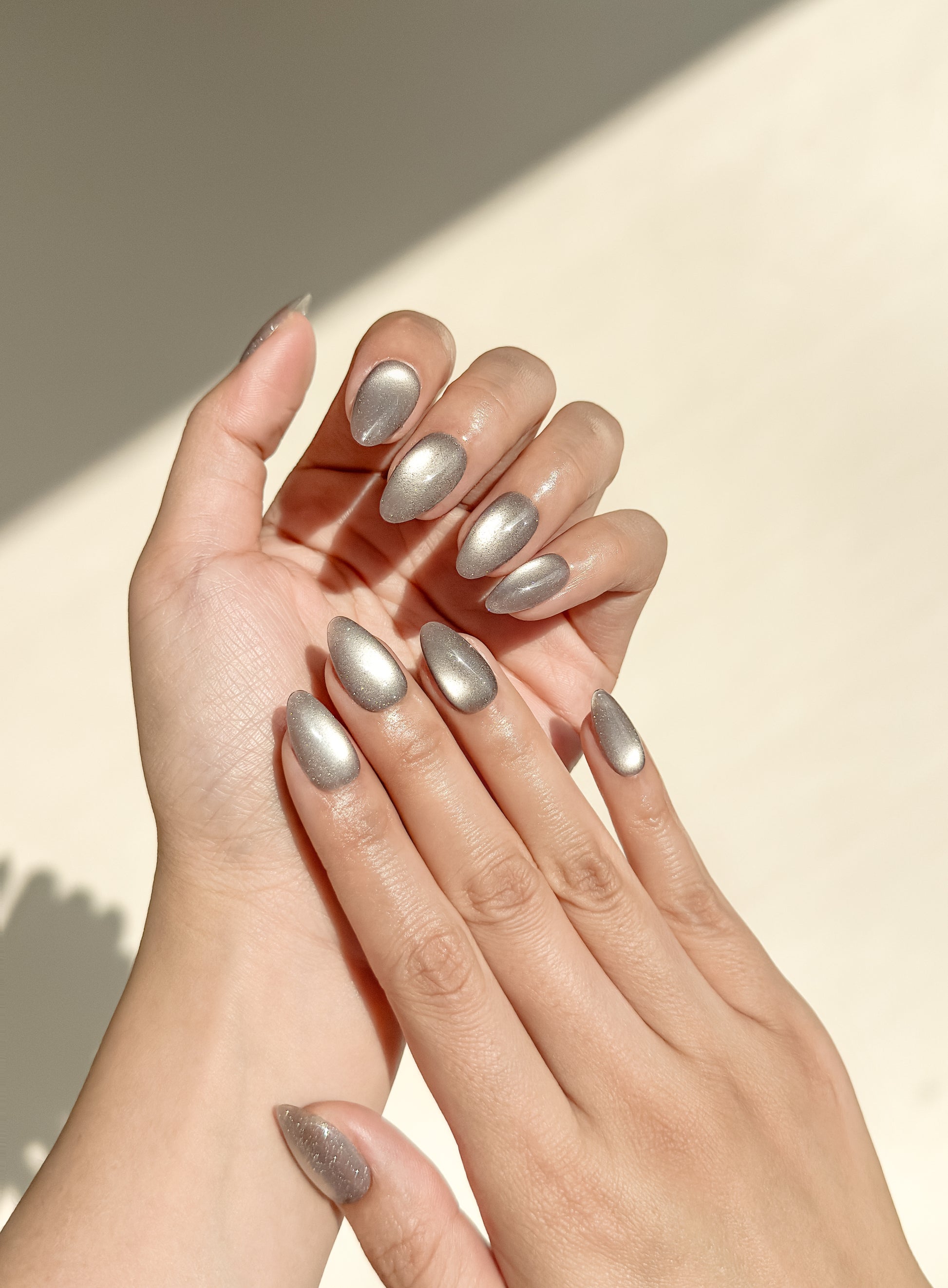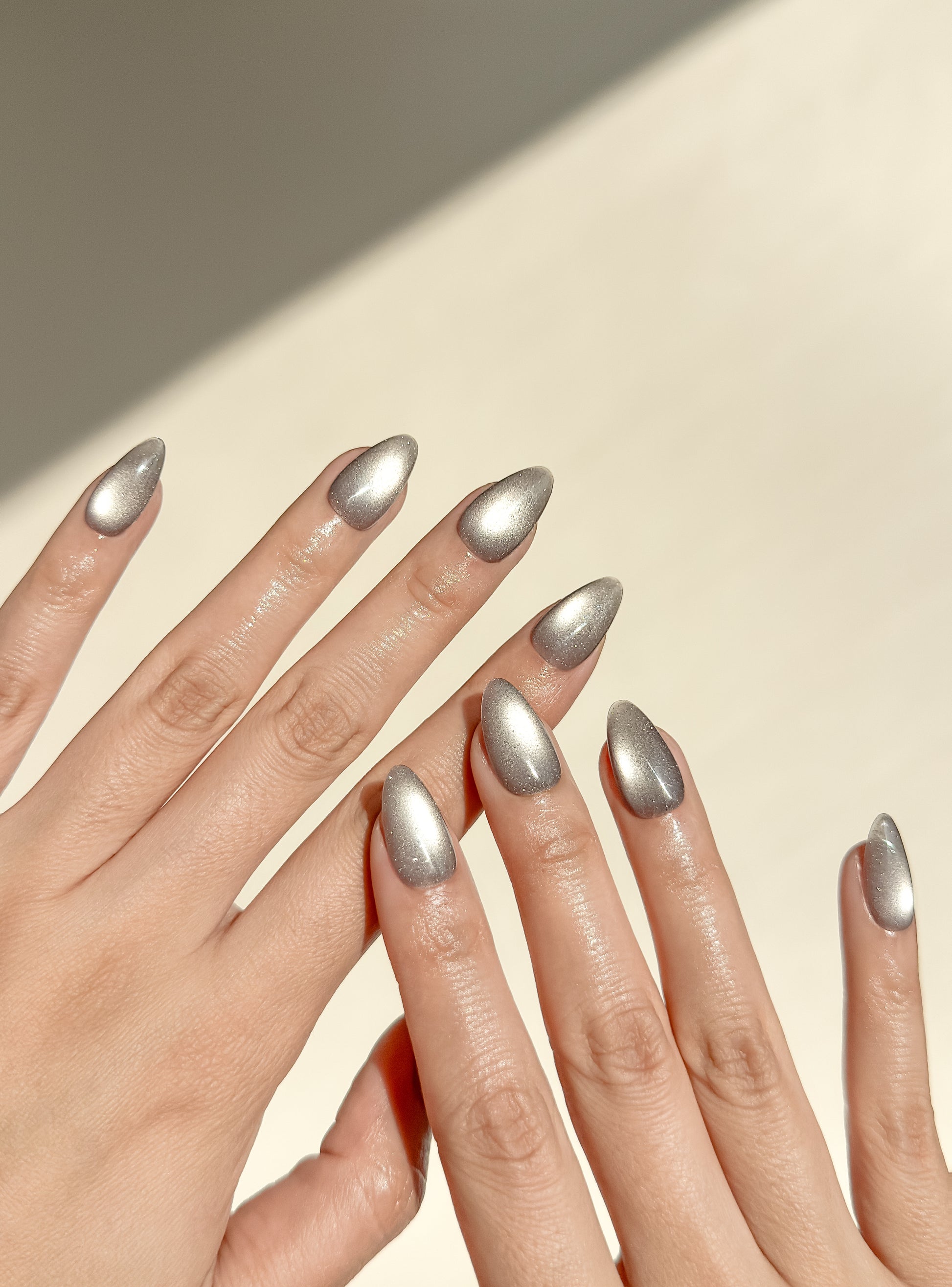 Moody grey base with a magnetic cat-eye shimmer that glows like lightning through clouds. Sparkling silver flecks dance across each nail - dramatic, electric, and mesmerising.