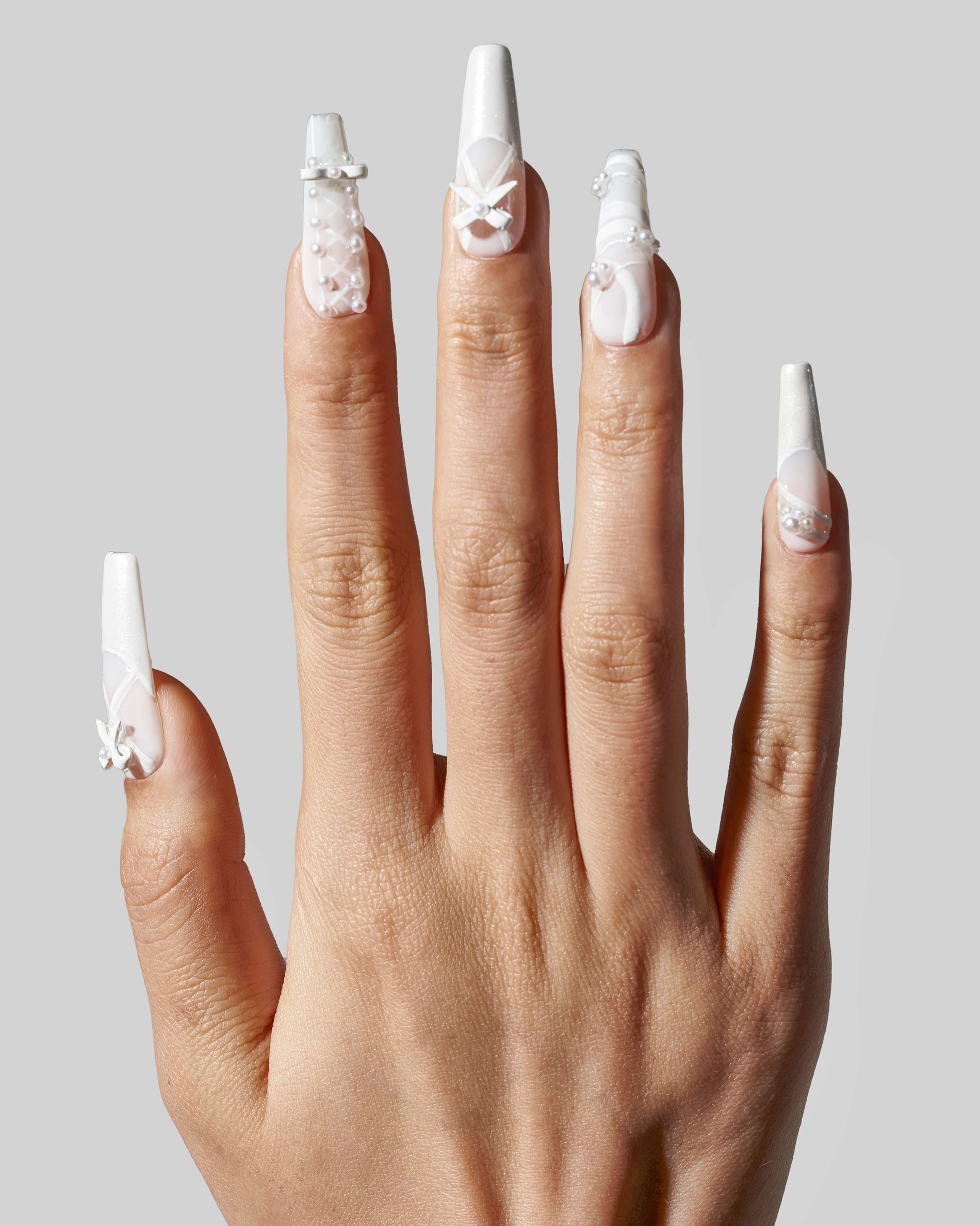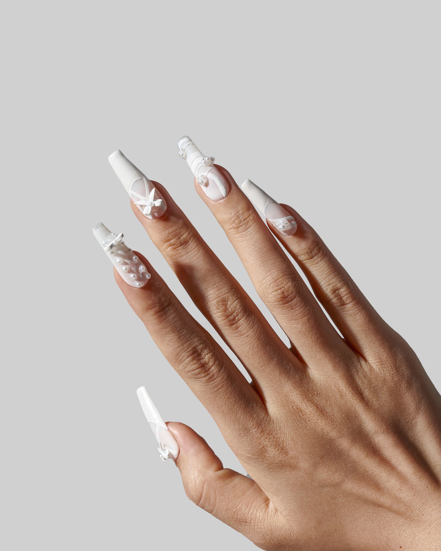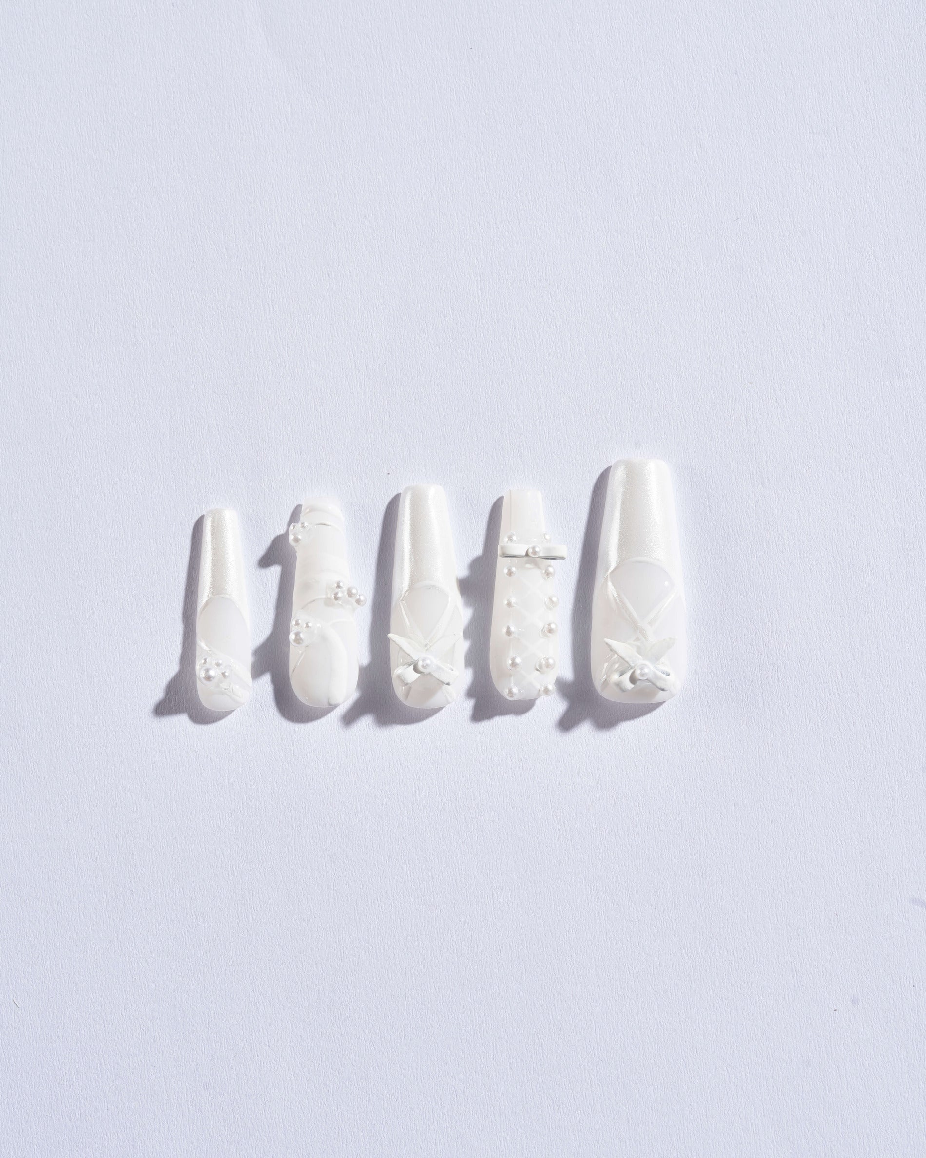 Get on the Balletcore trend with this pearlescent white set in a long, elegant coffin shape. Painted using pearlescent white in matte effect, the set features delicate bow and lace-up 3D designs and pearl embellishments, for that ultimate chic look.