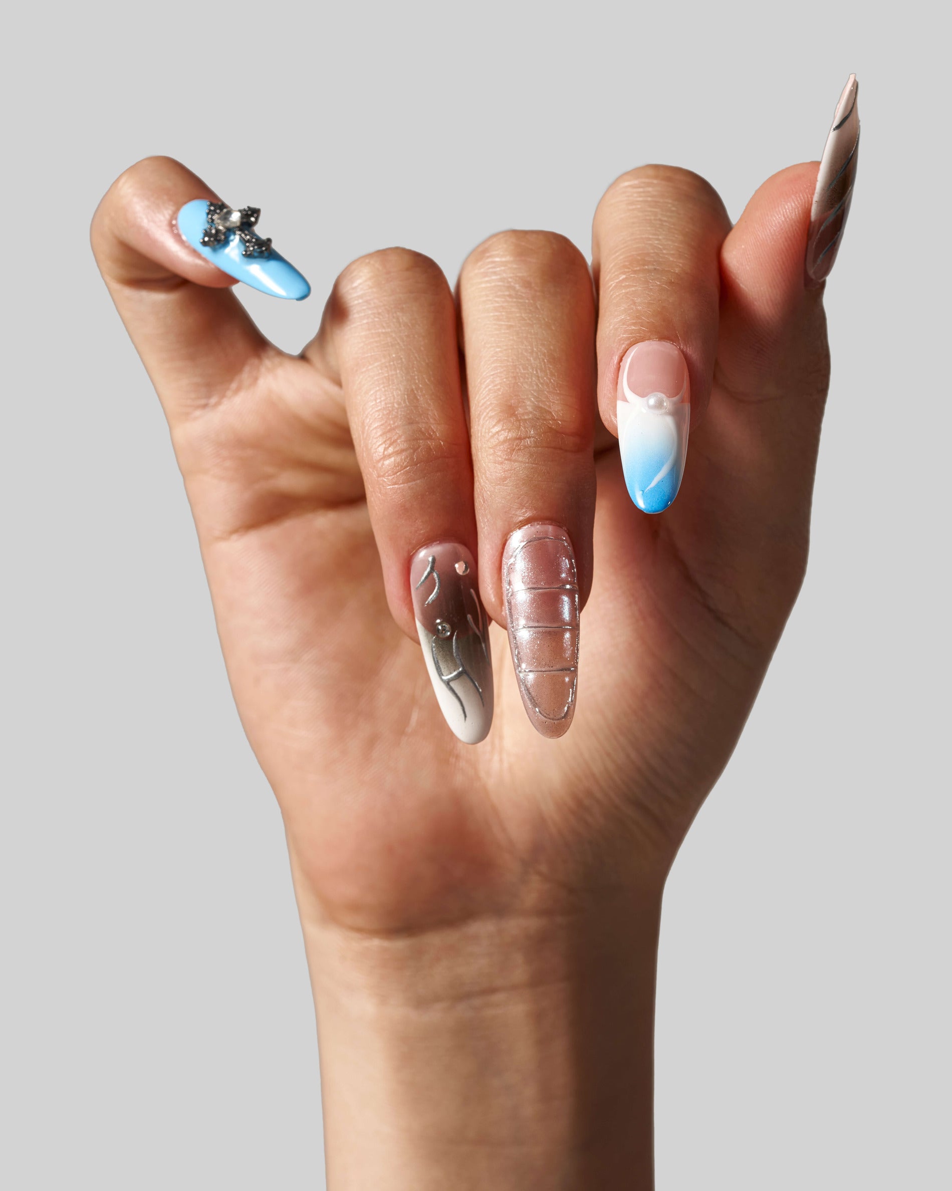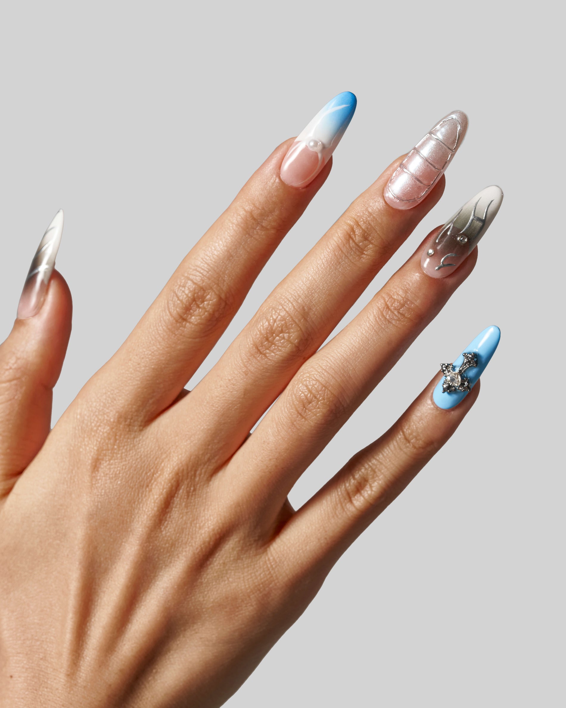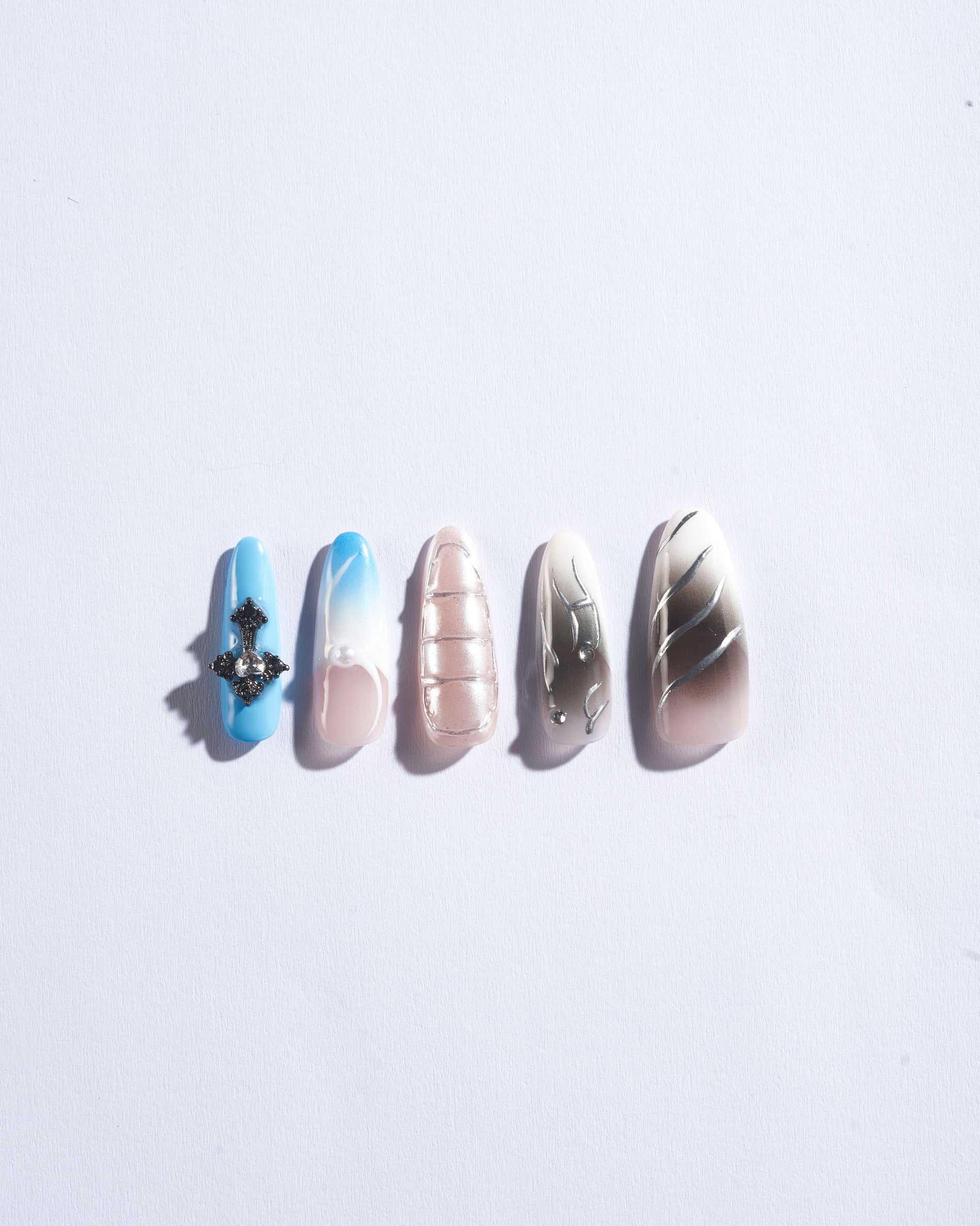 A perfect blend of early 2000s nostalgia with a modern twist, these nails feature a soft pastel blue base paired with bold black accents. The look is elevated with silver 3D designs and sparkling crystal embellishments, adding both drama and shine. Long and sleek, this set is your go-to for making a statement with a touch of Y2K-inspired glam.
